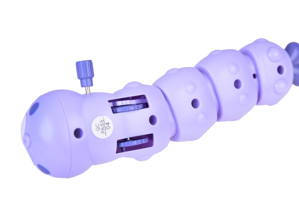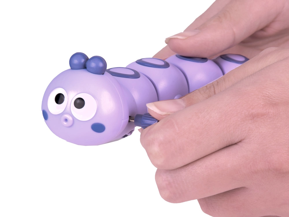 Basta con girar varias veces la llave lateral y la oruga se pondrá en marcha sola. Los niños observan el movimiento ondulante, aprenden el principio de causa y efecto y se divierten persiguiéndola por el suelo.