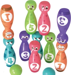 El set incluye 10 bolos, cada uno con una cara diferente y en colores variados, lo que atrae la atención de los niños y los anima a jugar. Además, los bolos tienen superficies superiores aplanadas, lo que permite apilarlos y crear torres de colores. Así, el niño puede disfrutar no solo del juego tradicional de bolos, sino también del apilado creativo.