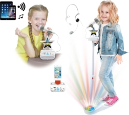 Con este set de karaoke Bluetooth disfrutarás de mucha diversión. Incluye un módulo de karaoke, un soporte con micrófono y un micrófono de diadema que garantiza un canto estable y cómodo incluso en movimiento. El panel de control está equipado con un soporte para móvil o reproductor MP3, para que puedas seguir fácilmente letras o vídeos.