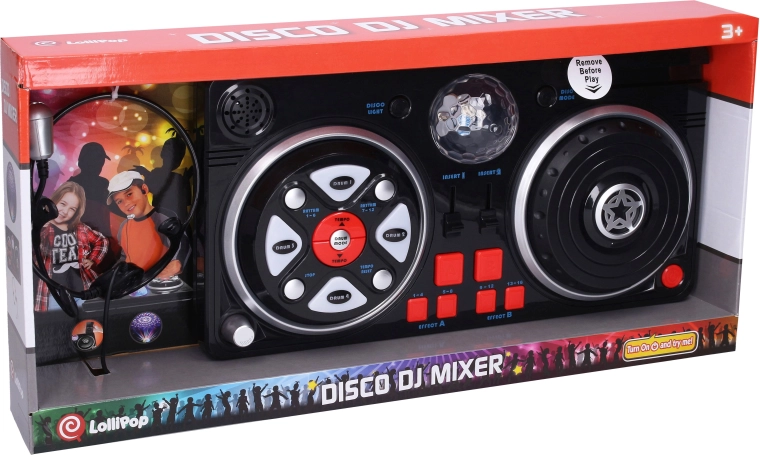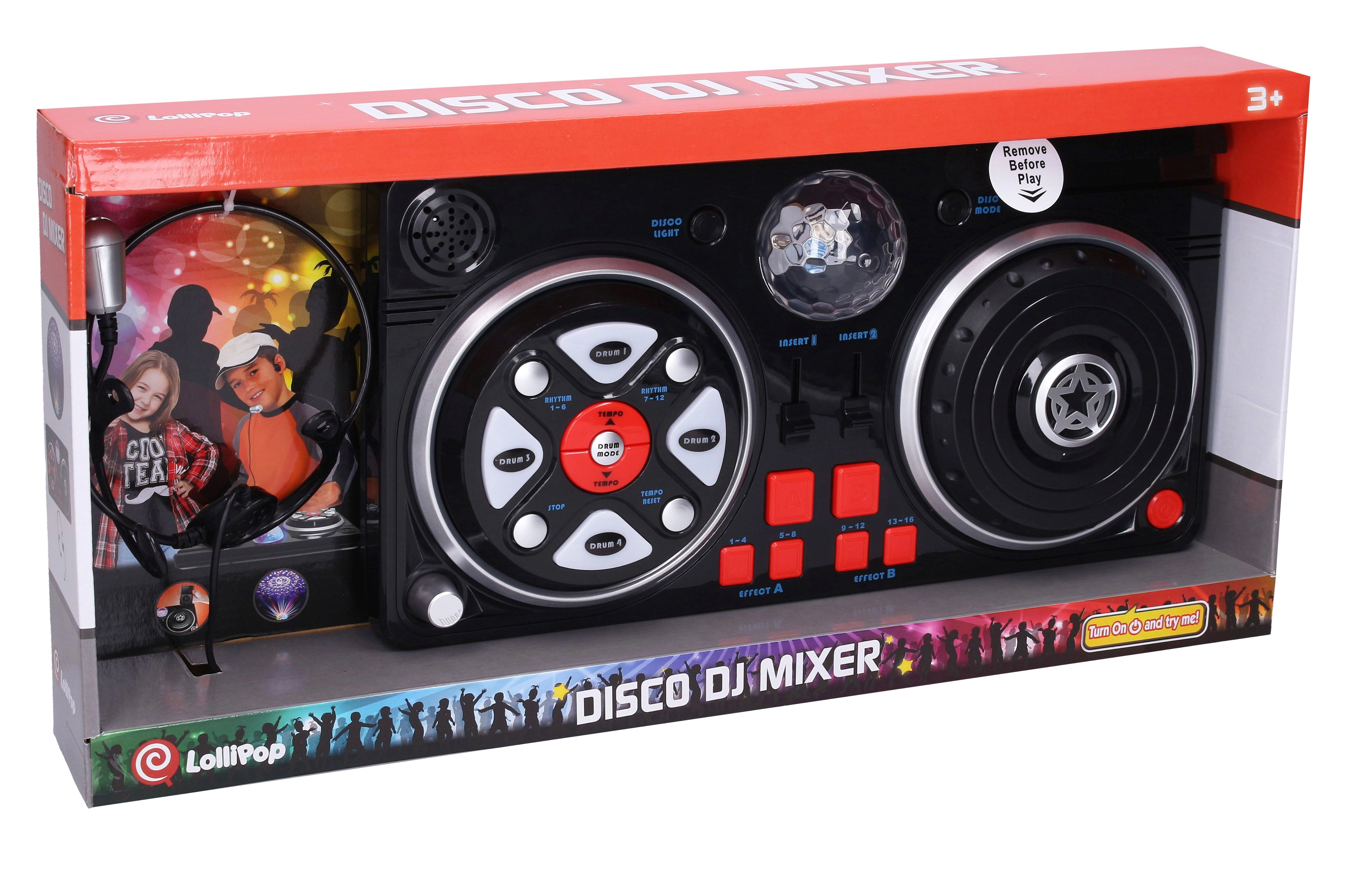 Divertida mesa de mezclas para niños con micrófono de diadema y bola de discoteca luminosa que aporta una gran fiesta en casa. Ofrece efectos de luz y sonido, hasta 6 efectos de disco, 16 efectos, 12 ritmos y 12 sonidos de batería. Incluye ajuste de tempo y volumen, soporte para móvil/mp3 y apagado automático para ahorrar energía. Las pilas 4× AA están incluidas en el paquete.