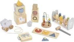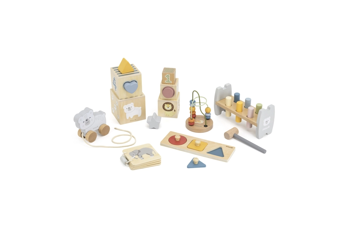 - Banco de golpeo con martillo, cubos para apilar/encajar, ábaco de alambres con cuentas, formas sencillas para encajar, librito de madera, osito de arrastre