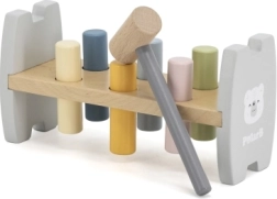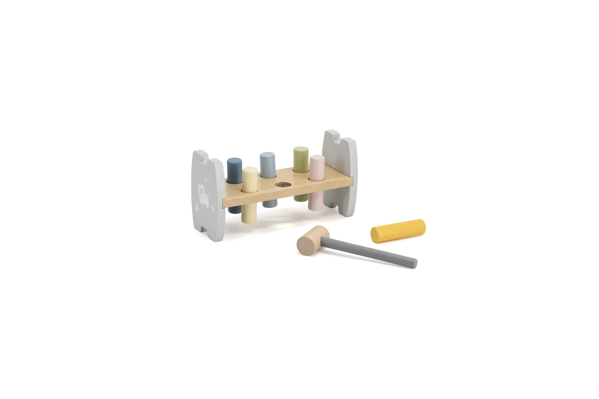 Los pasadores de colores y el martillo de madera entrenan la precisión del golpe, la coordinación mano‑ojo y la flexibilidad de la muñeca, ideal para los primeros logros motrices.
