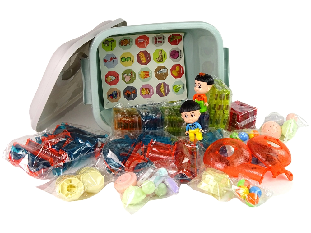 - 150 piezas incluyendo canicas luminosas, bloques magnéticos, figuras (2 uds) y pegatinas