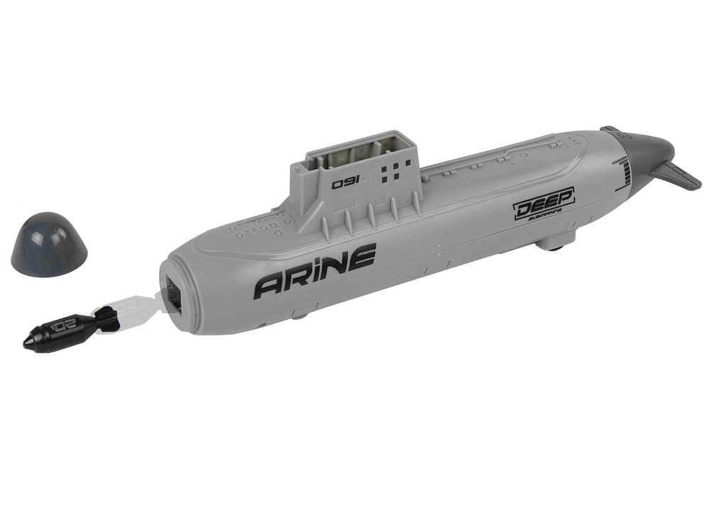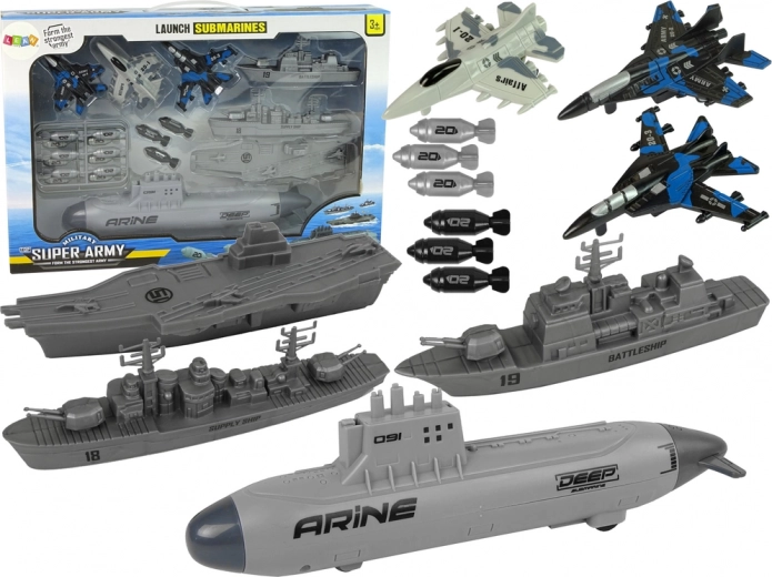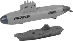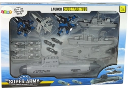 La pieza destacada es el submarino con lanzador mecánico y ruedas para un movimiento fluido por el suelo. Introduce el proyectil por arriba, tira de la parte trasera y dispara: las bombas de plástico seguras añaden un elemento de acción al juego. La flota se completa con un buque de guerra, un barco de suministro y un portaaviones, mientras que tres cazas proporcionan apoyo aéreo para cada misión.