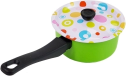 - Contenido del set: olla, cazo, sartén, cuenco, 2× tapa, salero, pimentero, 4× utensilios de cocina, varios alimentos.