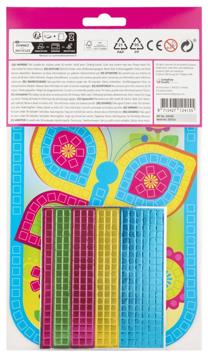 Este set creativo contiene todo lo necesario para crear un mosaico luminoso con motivo de mariposa. Solo tienes que seguir las indicaciones de color en la plantilla e ir pegando los cuadraditos de espuma metálicos en los lugares correctos. El resultado es una imagen reluciente en formato A5 que encantará tanto a los pequeños creadores como a sus padres.