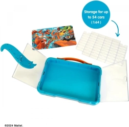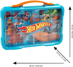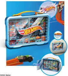 Elegante maletín/garaje para una colección de coches a escala 1:64 con puertas transparentes, capacidad para hasta 54 vehículos y logotipo HOT WHEELS iluminado. Ofrece asa práctica para el transporte y opción de montaje en pared, para mantener tus favoritos siempre seguros y perfectamente expuestos.