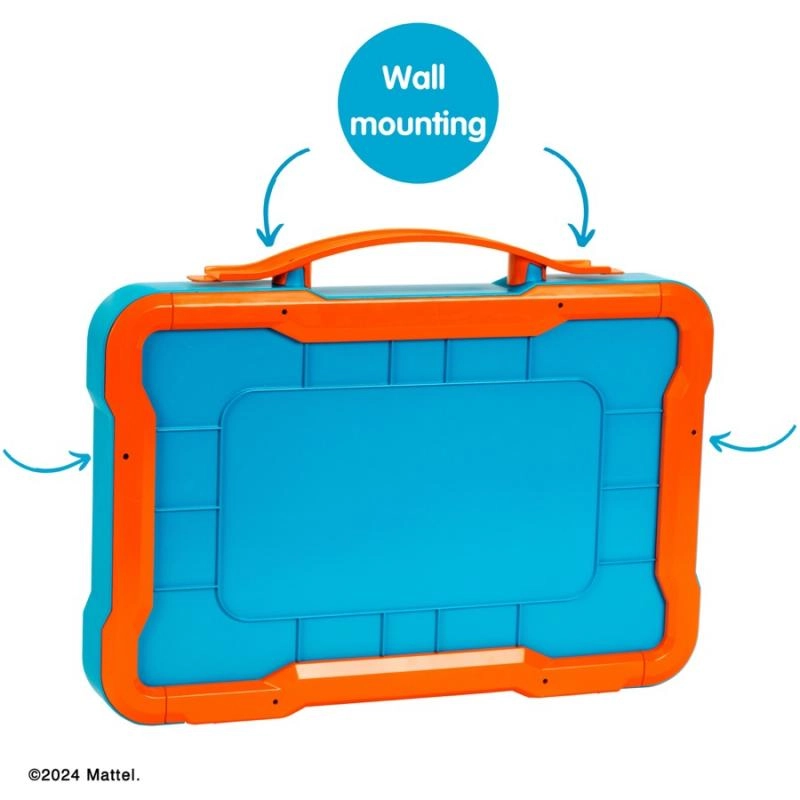 Organiza y protege tu colección con un maletín elegante que funciona como vitrina portátil y garaje de pared. Las puertas transparentes con bisagras permiten un acceso rápido y una excelente exhibición de los modelos, mientras que el logotipo HOT WHEELS iluminado aporta un aspecto atractivo a toda la colección.
