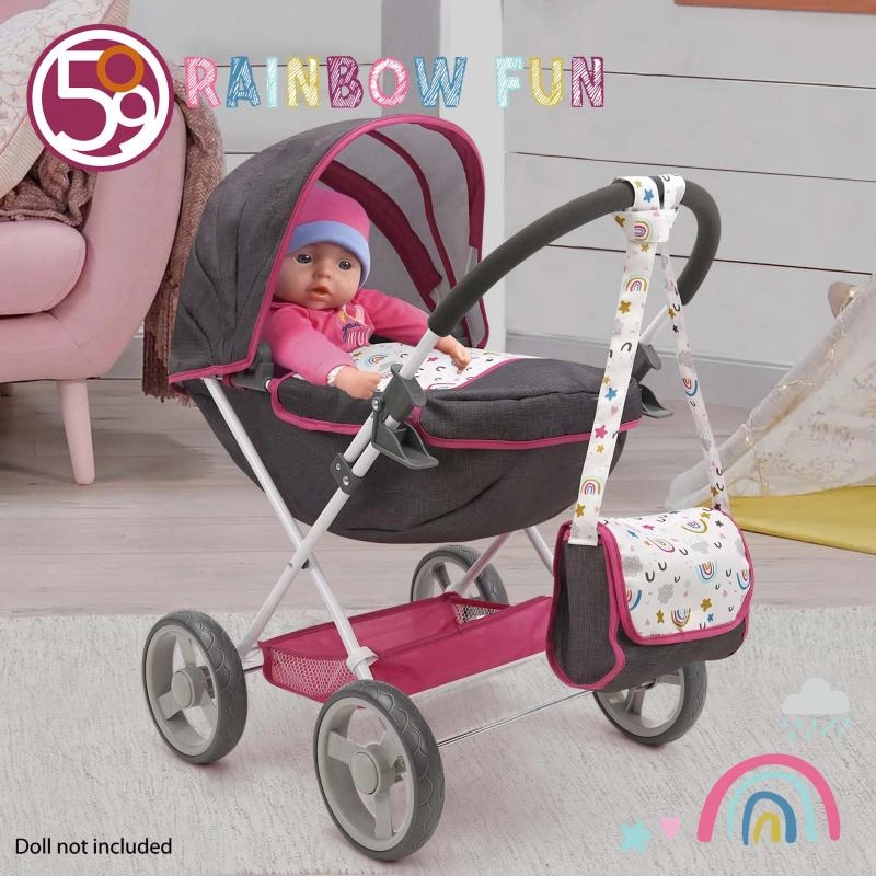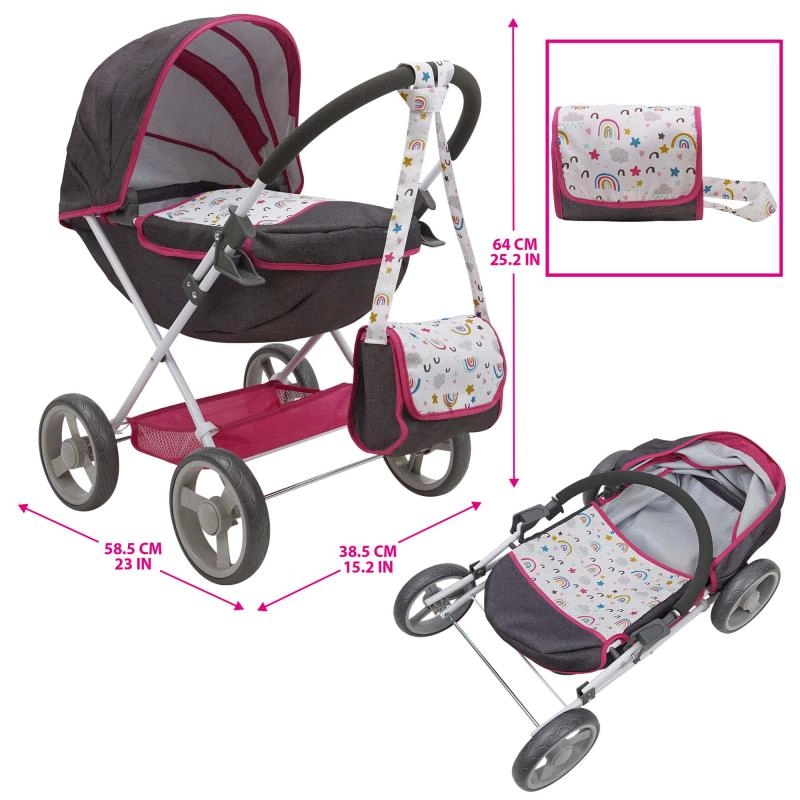 El cochecito es fácilmente plegable, por lo que podrás guardarlo rápidamente en el armario, en el coche o bajo la cama. La gran cesta ofrece espacio suficiente para accesorios y esenciales para el camino. Apto para la mayoría de muñecas estándar de 33–46 cm.