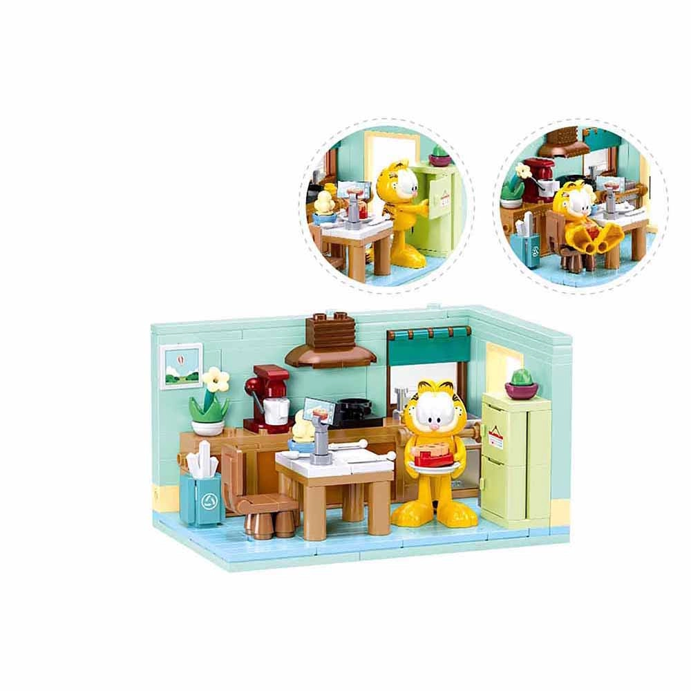 Combina fácilmente con LEGO, Cobi y Mega Bloks. Conecta la cocina con otras escenas y crea un mundo de Garfield más grande.