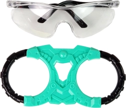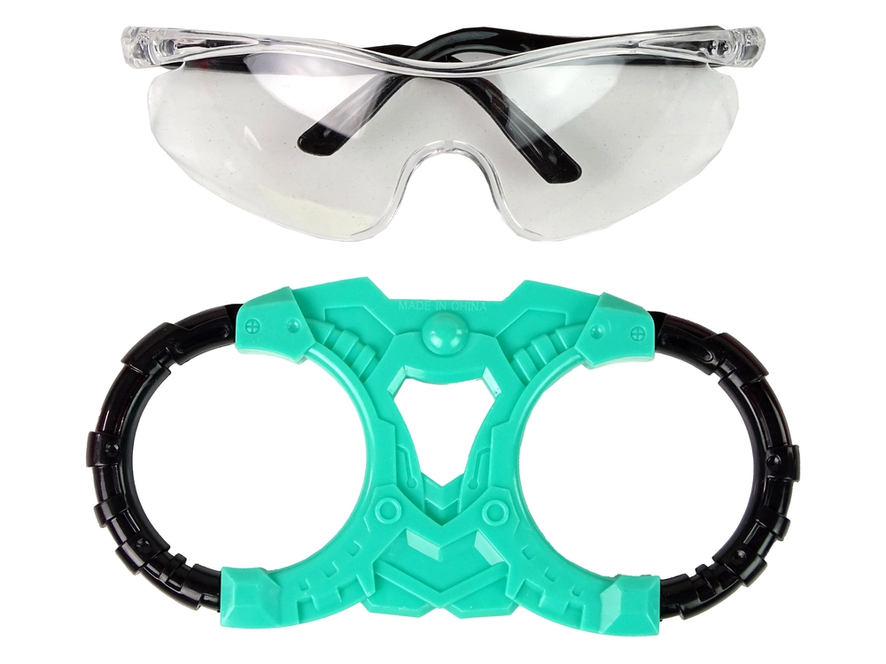 Las gafas transparentes protegen los ojos durante el juego y completan el aspecto futurista de todo el set.