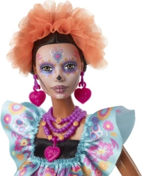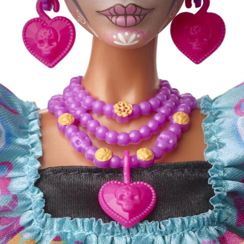 Con esta muñeca única de Barbie de la edición Día de Muertos 2024 puedes llevar la atmósfera de esta festividad excepcional directamente a tu hogar. La muñeca viste un conjunto sofisticado que combina una falda negra de satén con un corpiño fruncido azul y un cinturón anudado en tonos rosa. Este vestido está adornado con ricos bordados con motivos de huesos, flores y calaveras de azúcar.