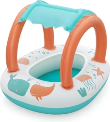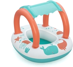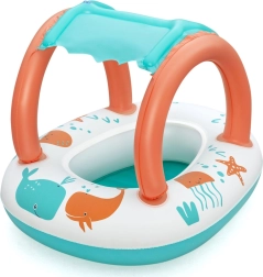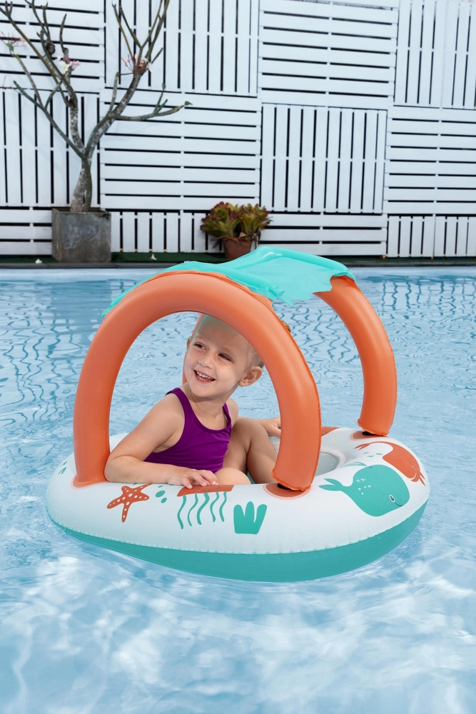 Ligero y cómodo, este barco para los más pequeños combina un divertido diseño marino con un práctico toldo con protección UV. La cubierta solar desmontable se fija con velcro, por lo que podrás adaptarla fácilmente al tiempo y a la intensidad del sol. Gracias al área de asiento cerrada con aberturas para las piernecitas, los niños disfrutan de un juego estable y seguro en el agua.