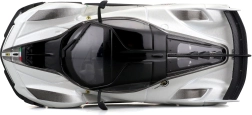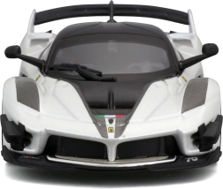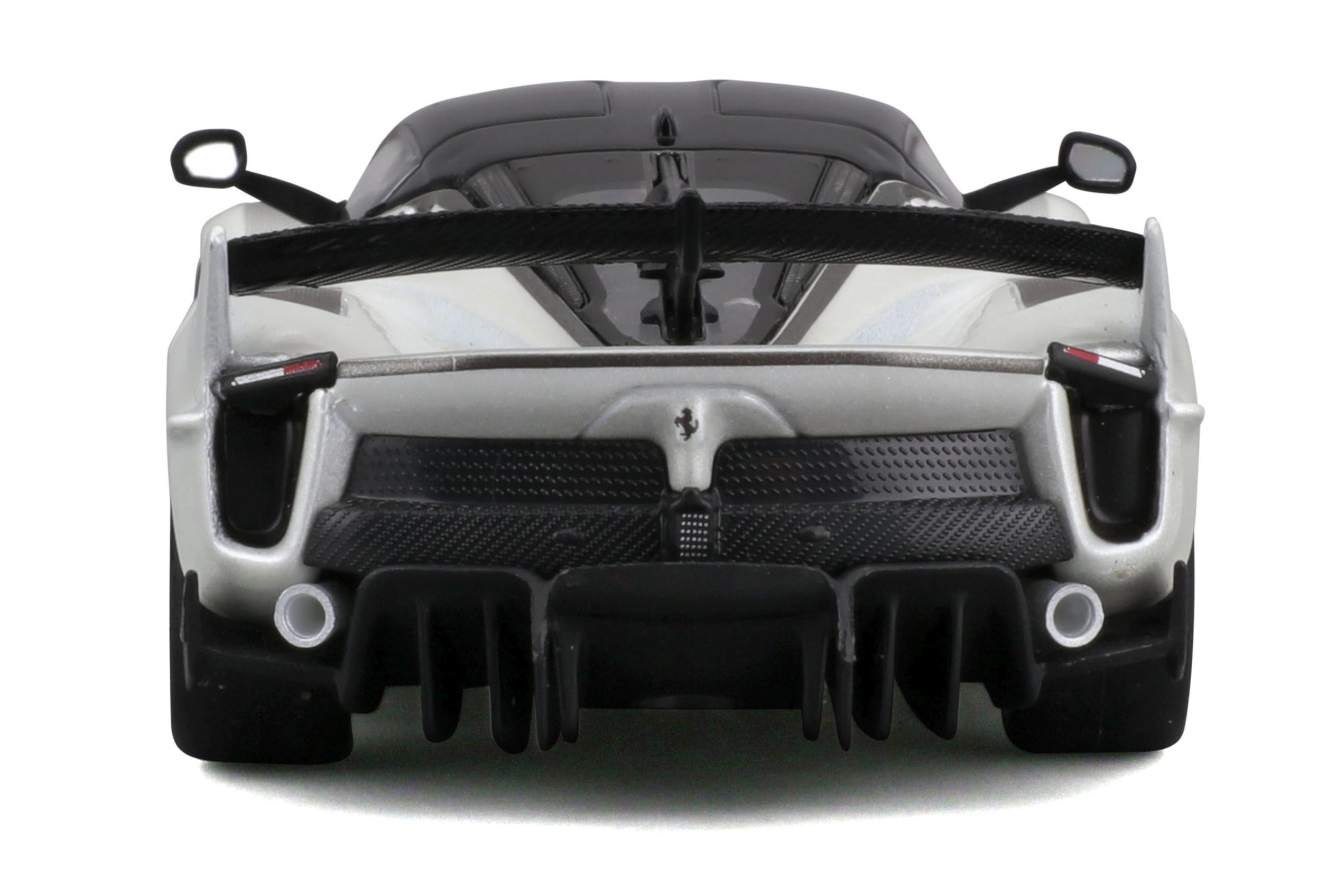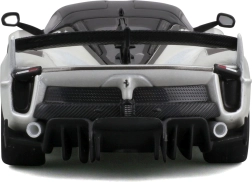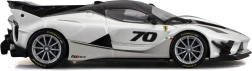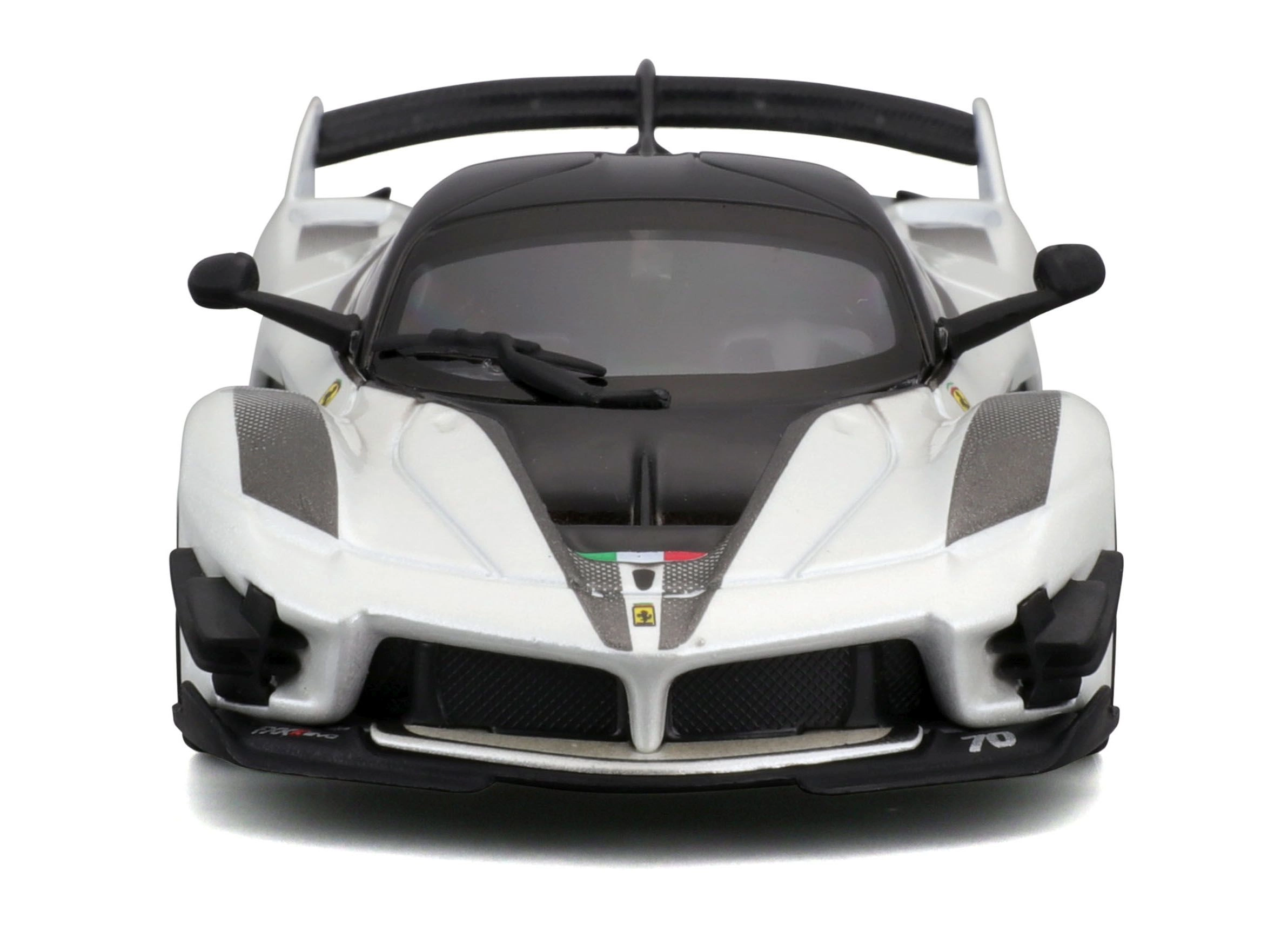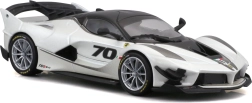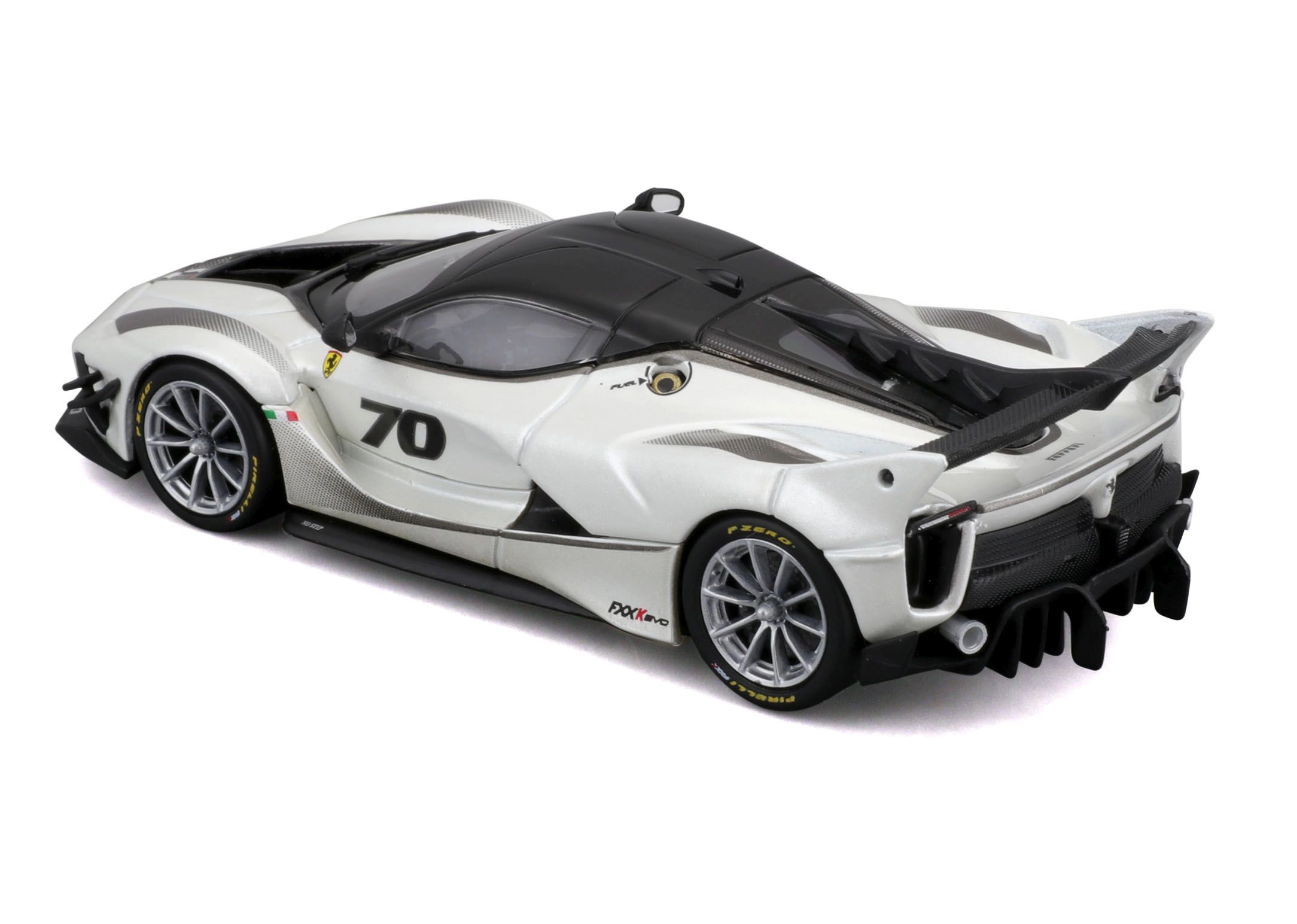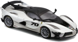 El modelo del Ferrari FXX-K EVO 2017, elaborado con gran detalle, ofrece proporciones realistas, líneas afiladas de la carrocería y elementos de competición como un gran alerón trasero, difusor y splitters frontales. El acabado en blanco y negro con el número 70 subraya el aspecto auténtico del especial de circuito.
