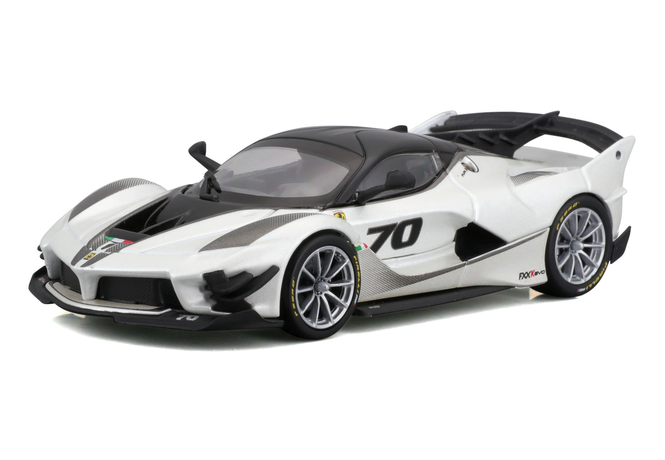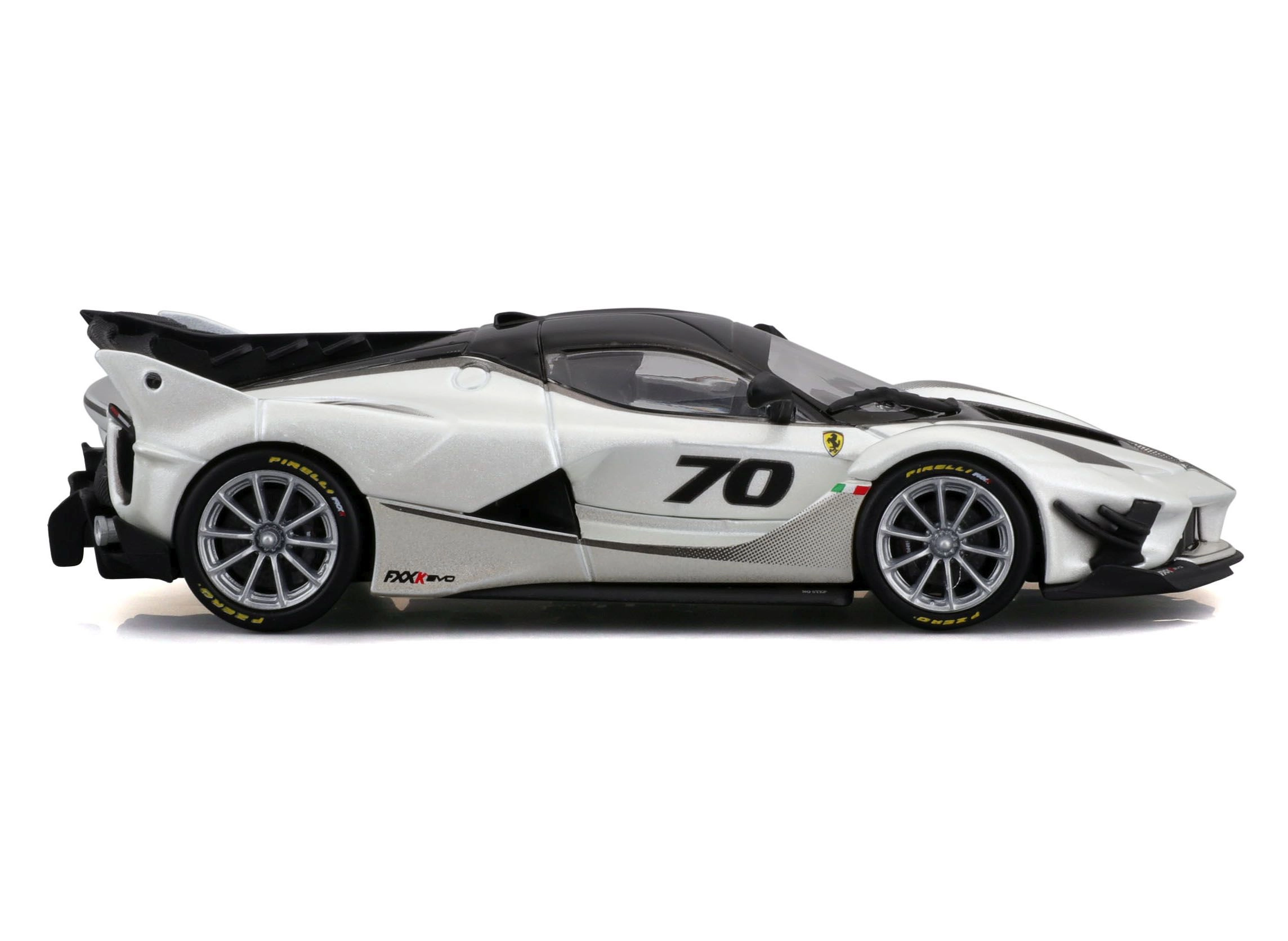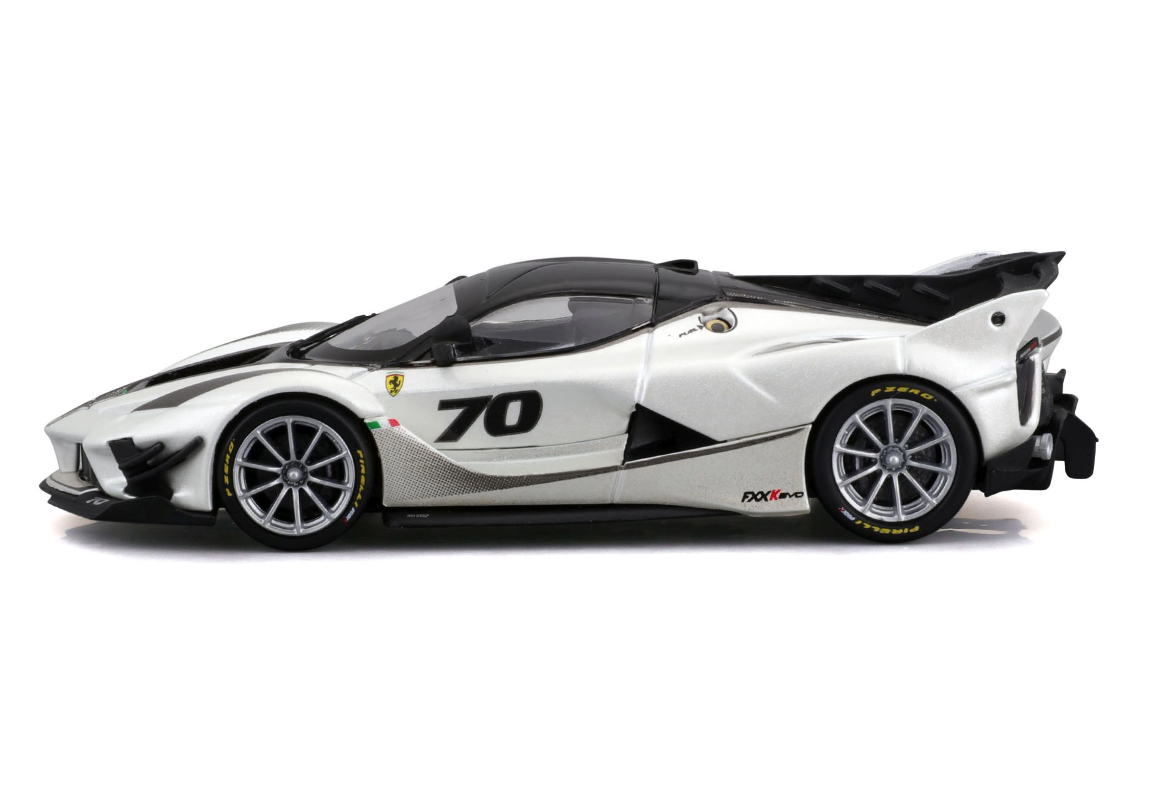 Marcados elementos aerodinámicos, el número 70 y una pintura en contraste blanco‑negro reproducen fielmente el especial de circuito FXX-K EVO.