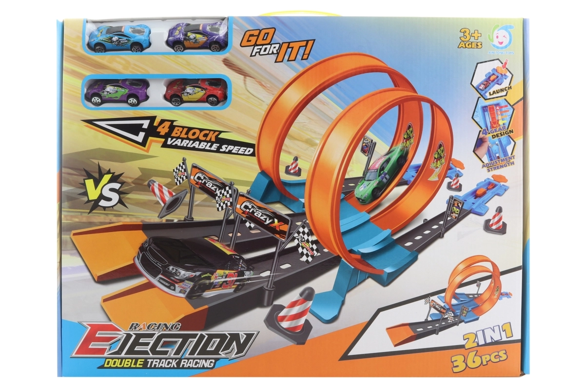 El pack incluye 36 piezas de pista y 4 cochecitos: ideal para carreras inmediatas sin comprar accesorios adicionales.