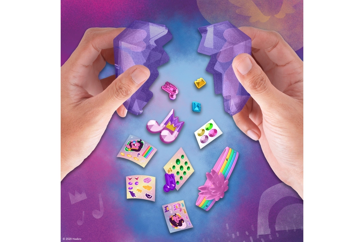 El paquete incluye hojas de pegatinas y colgantes para personalizar el poni y sus accesorios. También incluye una elegante pulsera de la amistad y tatuajes temporales, que amplían la diversión más allá del juego. Una gran elección para fans de MY LITTLE PONY y para niños creativos a partir de 5 años.