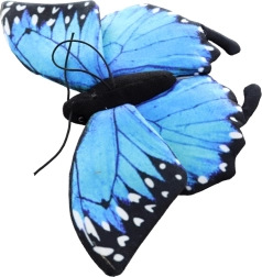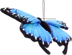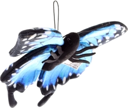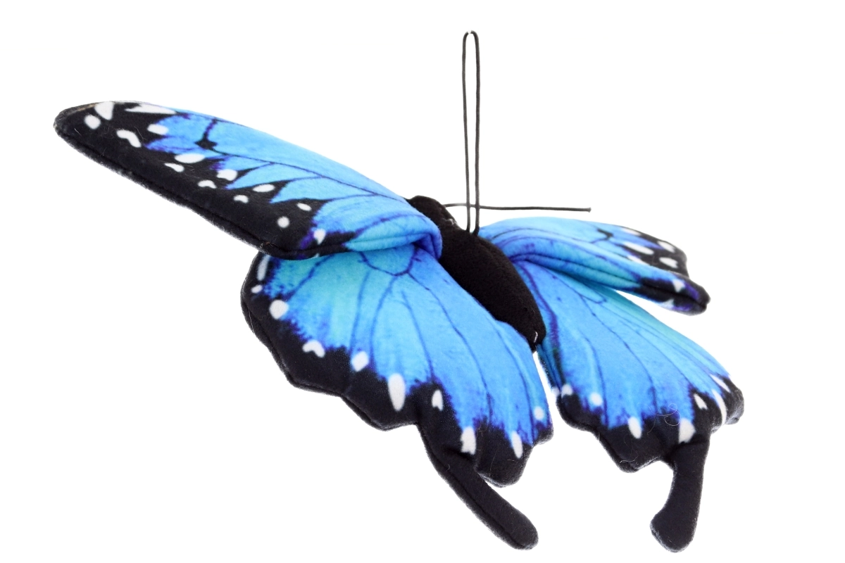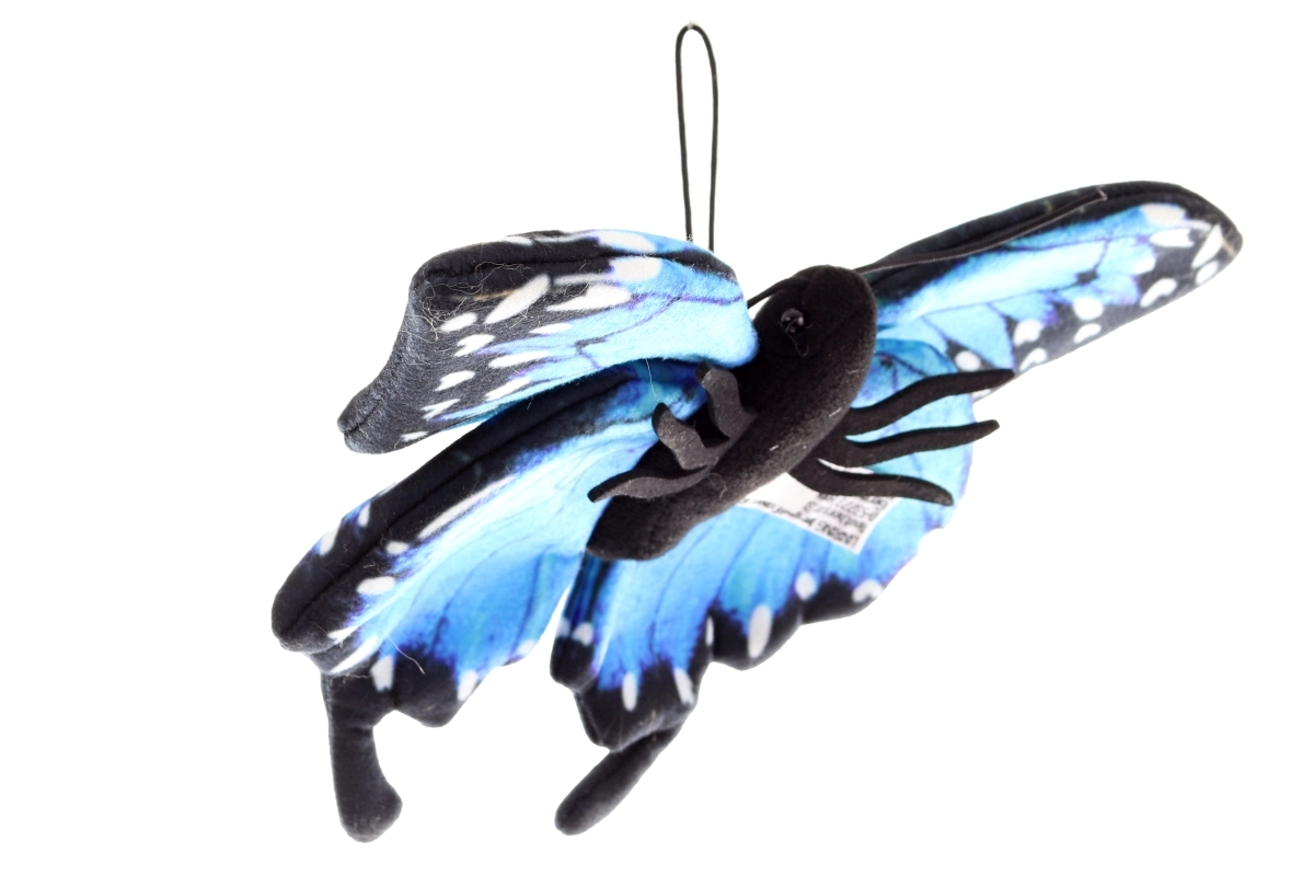 Esta mariposa de peluche destaca por sus llamativas alas azules con bordes negros y puntos blancos que imitan fielmente los patrones de la naturaleza. Su suave tejido textil es agradable al tacto y seguro incluso para los más pequeños (0+). Es perfecta como decoración para la habitación infantil o como un peluche relajante para abrazar a diario.