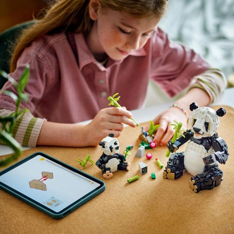 Construye una panda adulta y su cría con cabeza, cuello y patas articulados. Ideal para contar historias y para una exhibición impresionante.