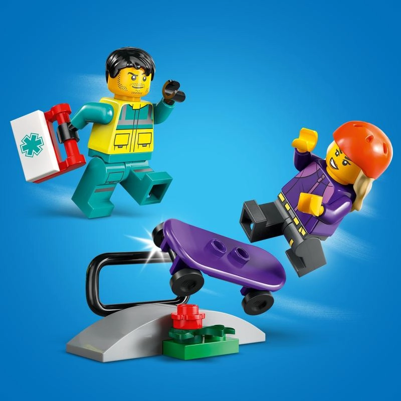 - ambulancia, rampa, minifigura de rescatista, minifigura de skater, camilla, jeringa, vendaje, maletín médico, skateboard