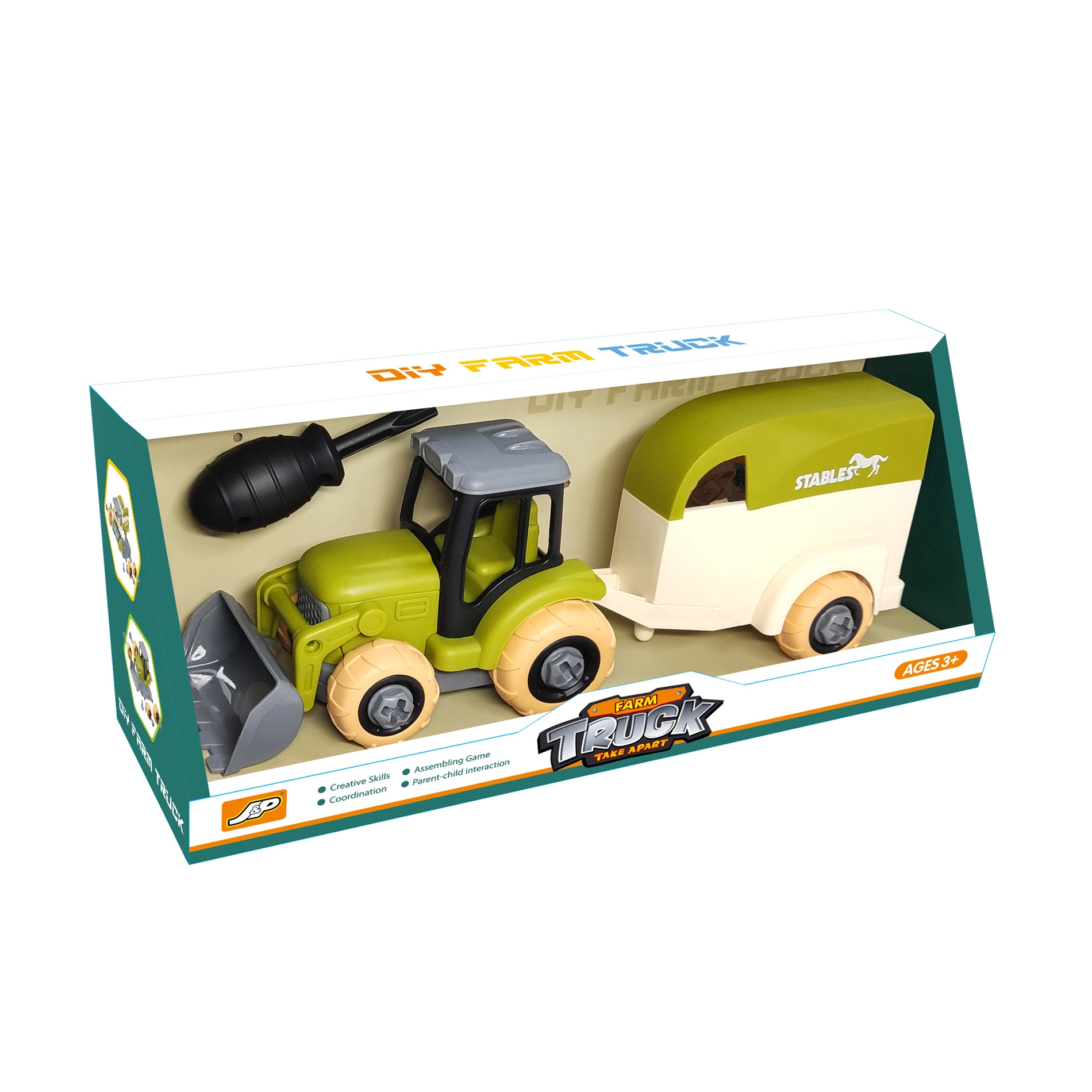 Este tractor atornillable con remolque ofrece a los niños todo lo que necesitan para un juego divertido y a la vez estimulante. Gracias al destornillador incluido, el vehículo se puede desmontar y volver a montar con facilidad, lo que favorece el razonamiento lógico y la paciencia. El remolque es ideal para transportar el caballito incluido y crear historias de granja propias.