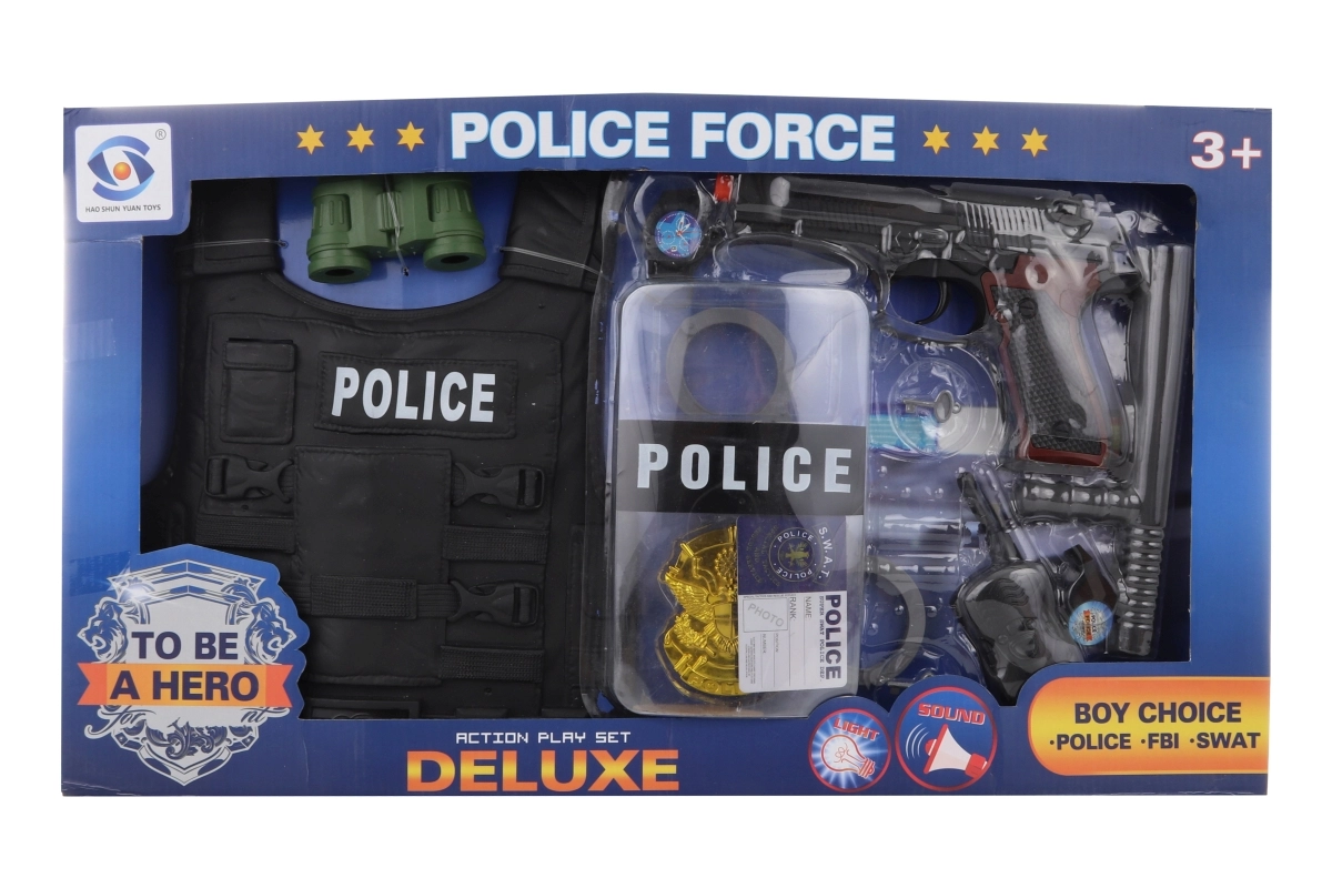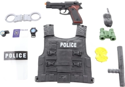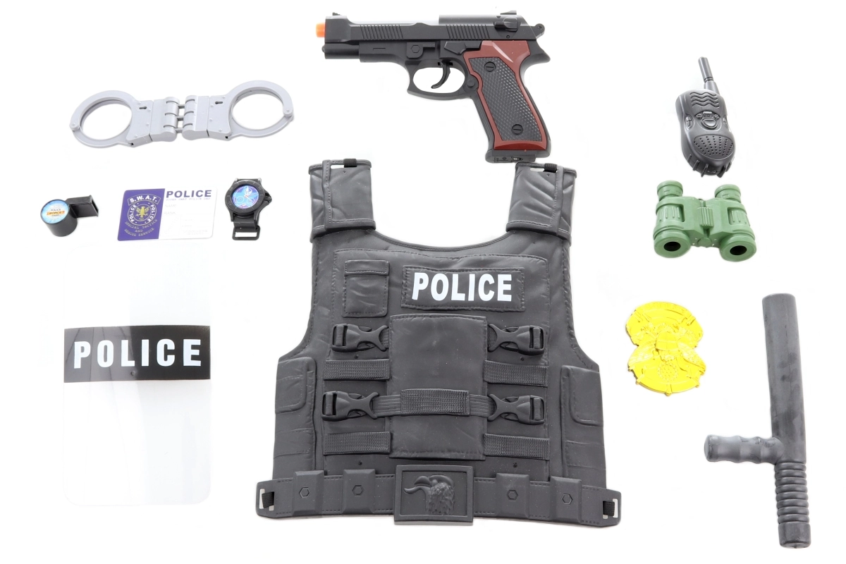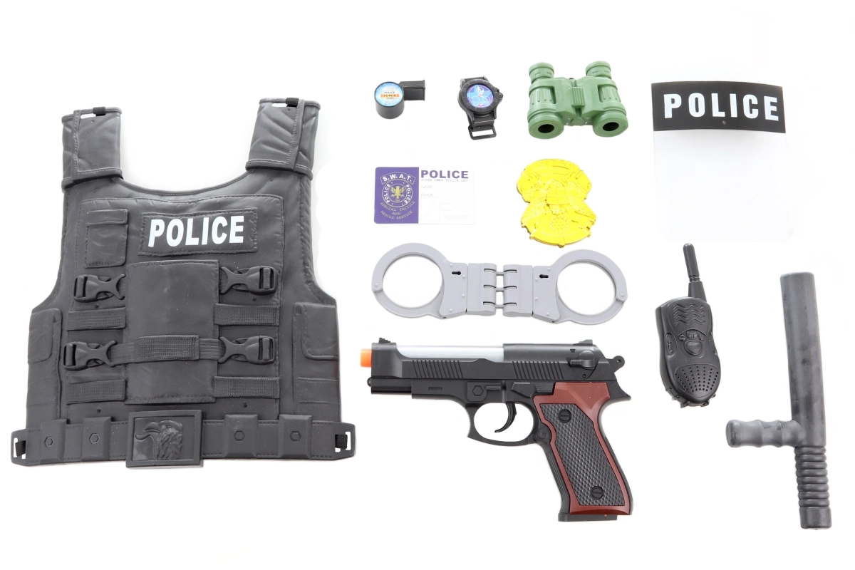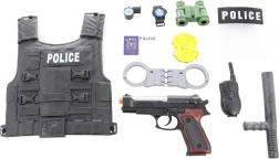 El set incluye chaleco, pistola a pilas, esposas, prismáticos y otros accesorios para un juego de policías realista.