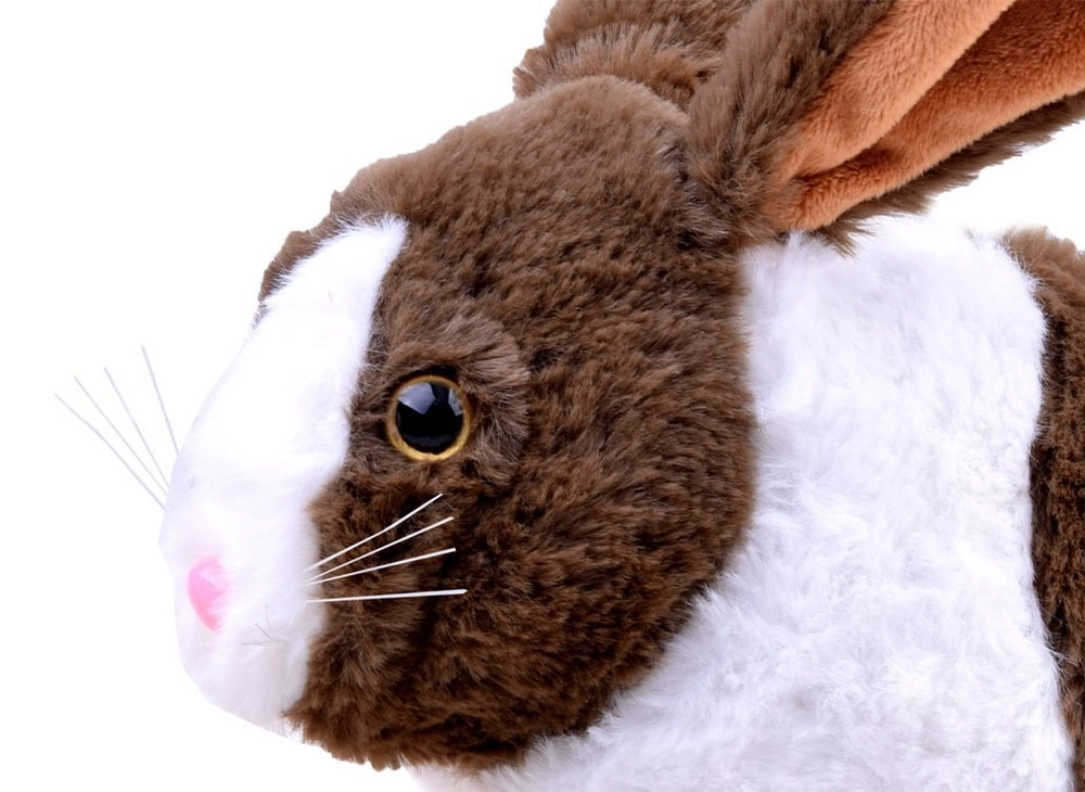 Detalles cuidados, pelito suave y ojos tiernos convierten al conejito en un fiel amigo para abrazar y jugar.
