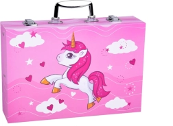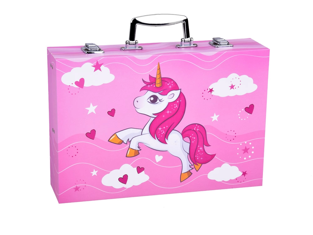 Maletín con un divertido diseño de unicornio, fácil de transportar gracias al asa metálica.