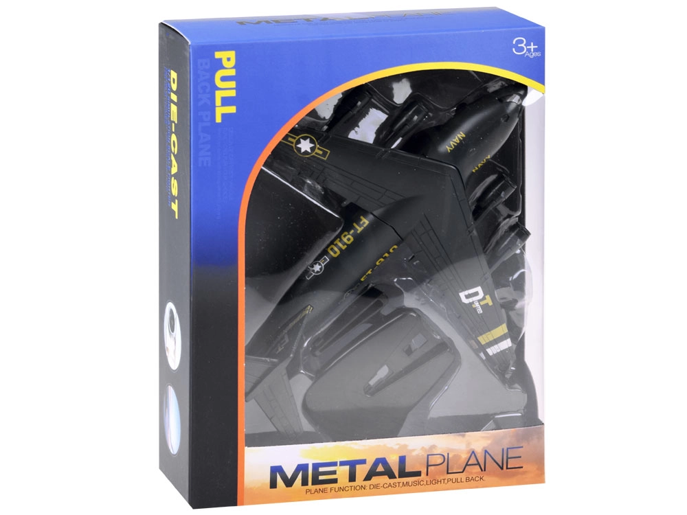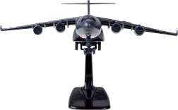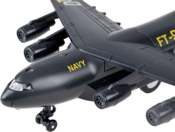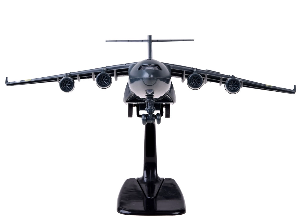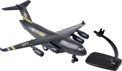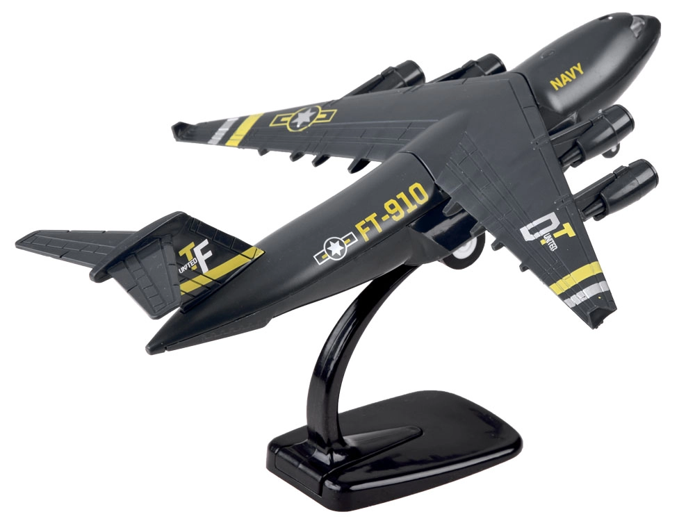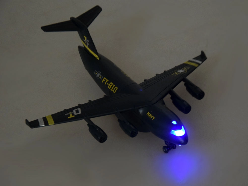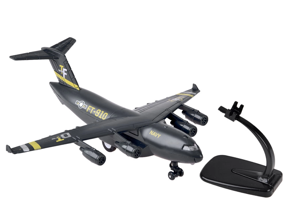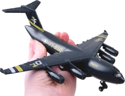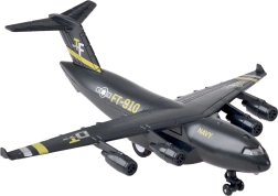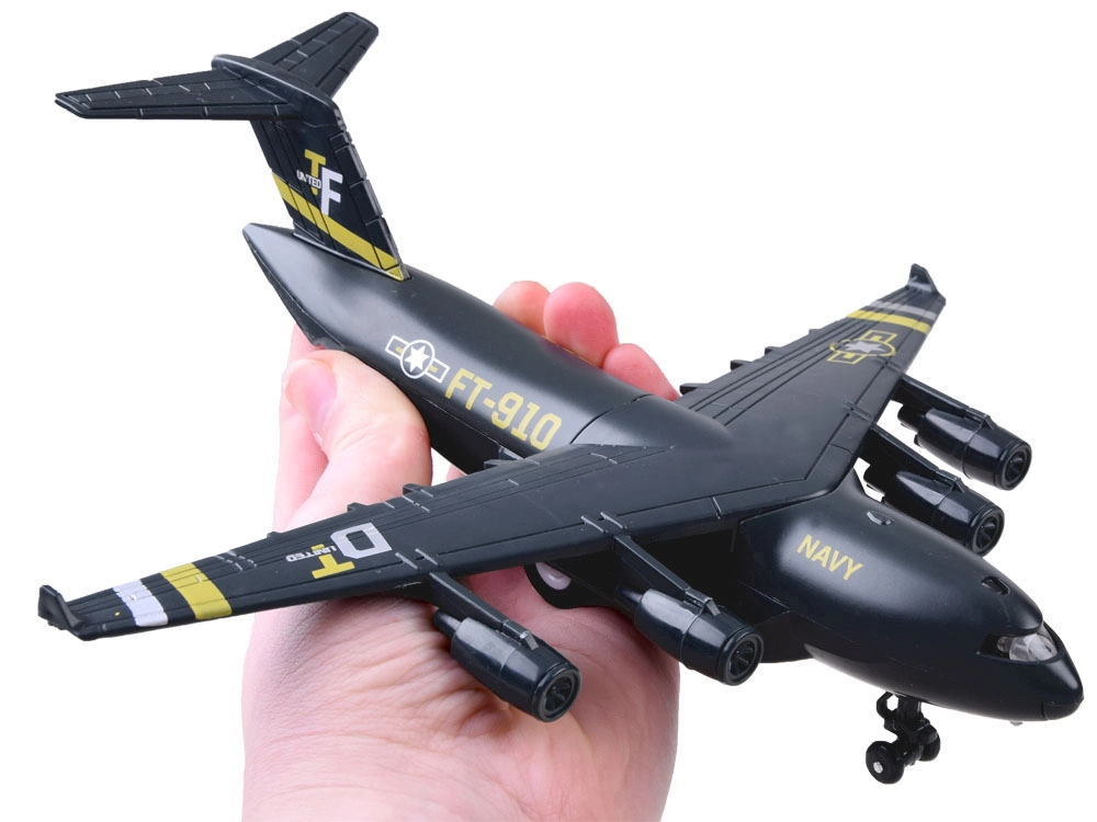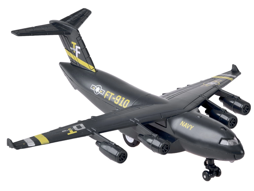 Este modelo de avión de transporte militar está cuidadosamente detallado en color negro con inscripciones doradas y plateadas. Está equipado con mecanismo de retroceso y efectos de sonido, lo que aporta diversión y estimula el desarrollo de la imaginación infantil.