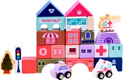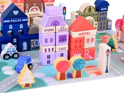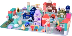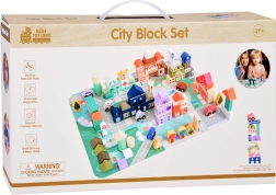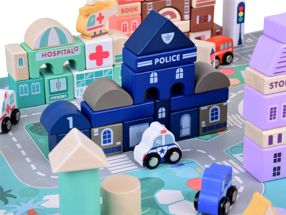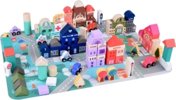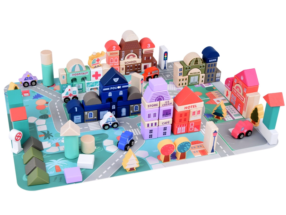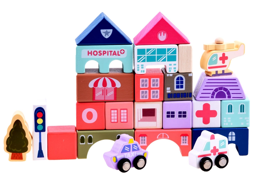 Este set en tonos pastel contiene 115 piezas de madera variadas, incluyendo edificios, vehículos, árboles y señales de tráfico. Los niños pueden construir su propia ciudad con escuela, hospital, banco y comisaría. Con este juego de construcción no solo desarrollan su imaginación, sino también sus habilidades motoras.