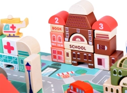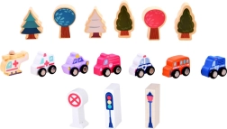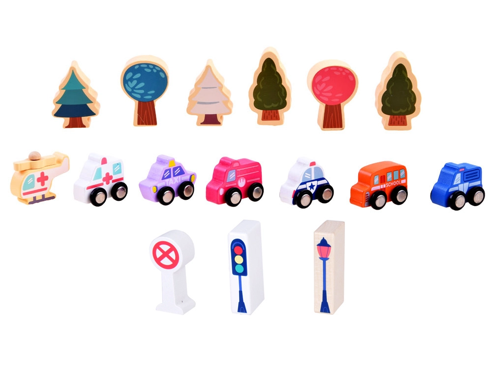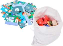 El paquete incluye también una alfombrilla de juego con motivo urbano que sirve como base para los escenarios de juego. La alfombrilla tiene calles señalizadas donde los niños colocan vehículos como taxi, ambulancia o camión de bomberos, familiarizándose así con situaciones y señales de tráfico.