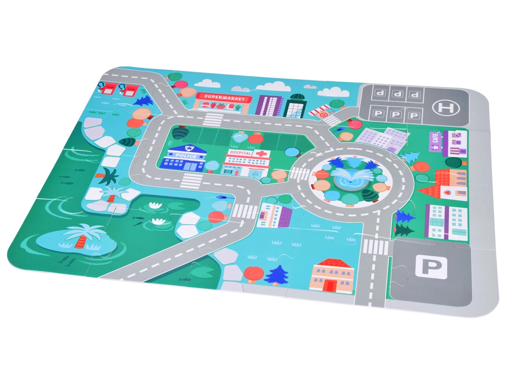 La alfombrilla muestra un paisaje urbano con carreteras y zonas de aparcamiento señalizadas, lo que invita a los niños a un juego didáctico con vehículos.