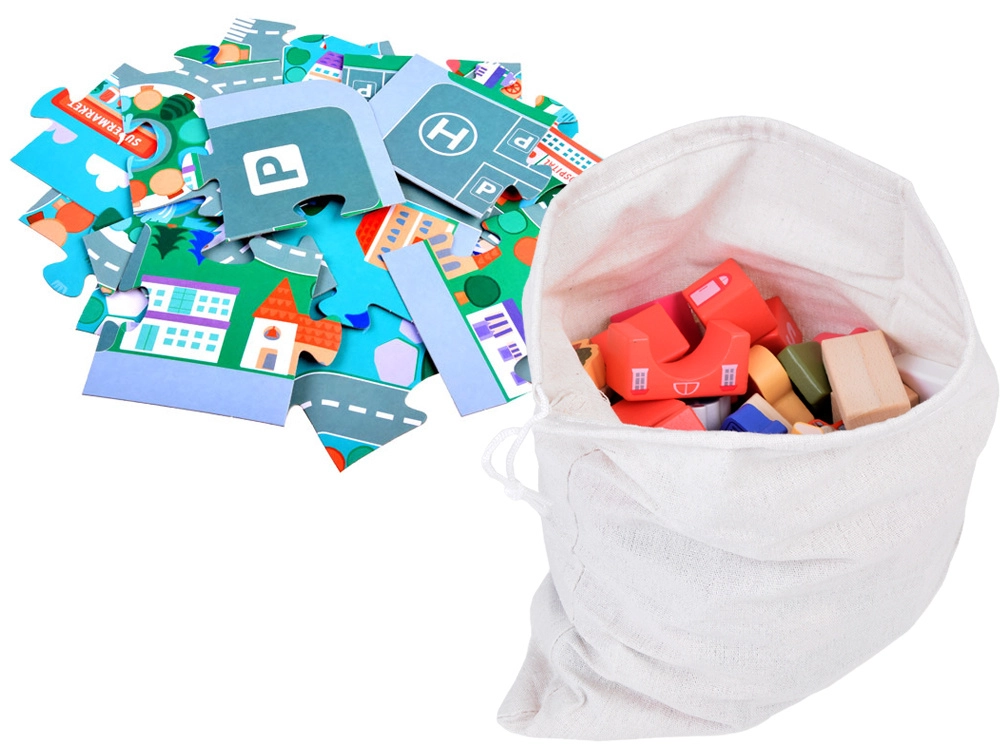 Después del juego, todas las piezas se pueden guardar nuevamente en la bolsa de tela incluida en el paquete. Mantiene el hogar ordenado.