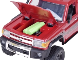 Carrocería detallada del TOYOTA LAND CRUISER, capó abatible y accesorios auténticos que destacan tanto en la vitrina como en la conducción off‑road.
