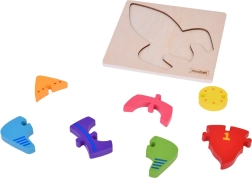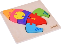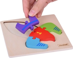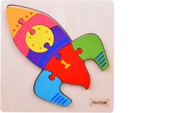 Los niños entrenan el agarre, la precisión y la concentración al encajar las 7 piezas en la silueta del cohete sobre la base de madera.