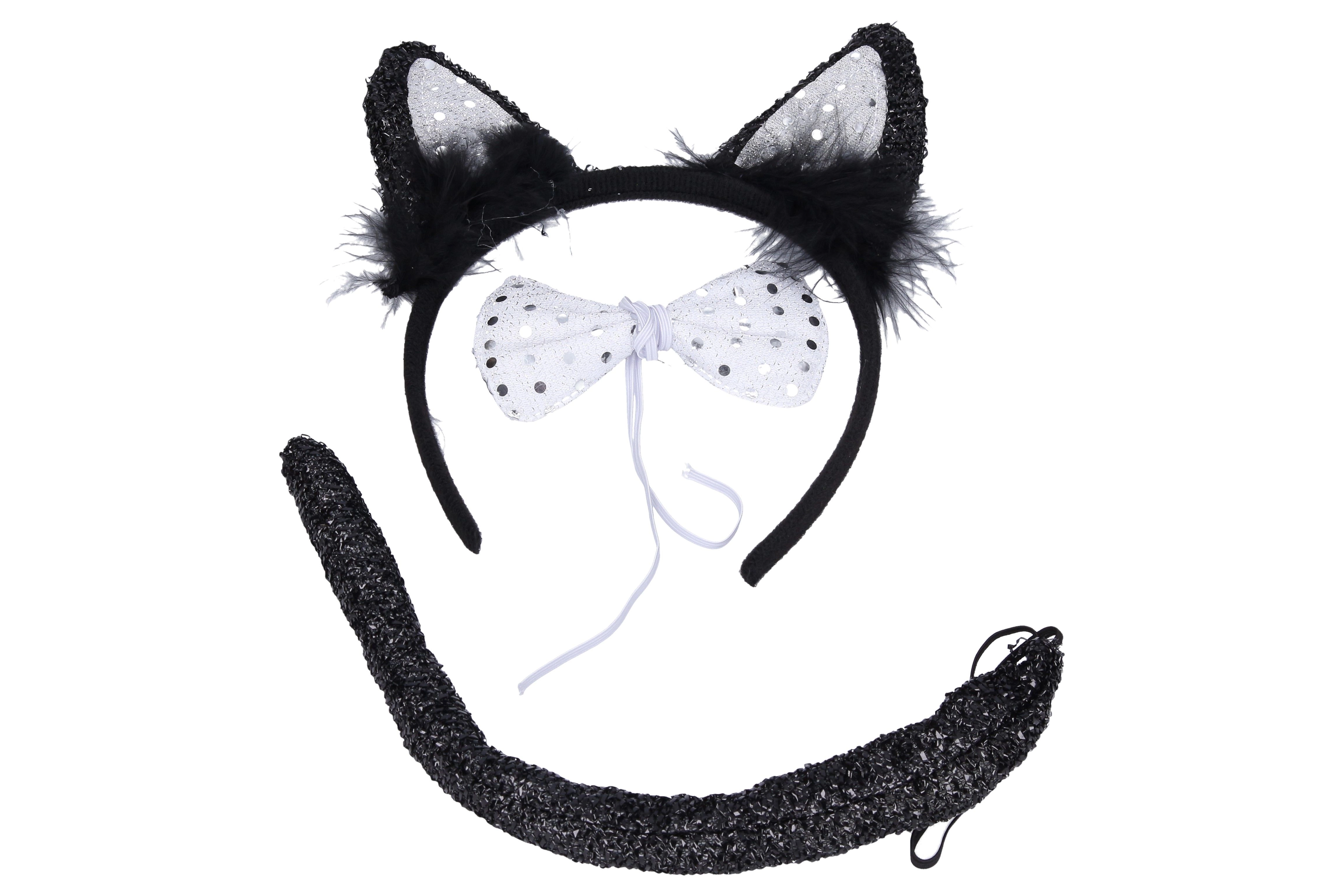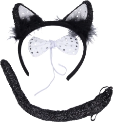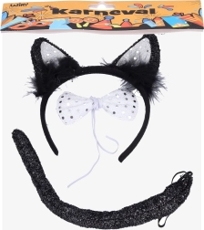 Elegante set de carnaval para amantes de los gatos que incluye todo lo necesario para una transformación rápida. Encontrarás una diadema con orejas de gato, una pajarita y una cola, ideales para carnaval, bailes de disfraces y fiestas temáticas.