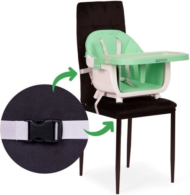 El asiento se desmonta fácilmente y, con las correas, se fija a una silla normal. Ideal para casa, visitas y vacaciones: el niño siempre tiene su lugar seguro en la mesa.