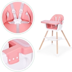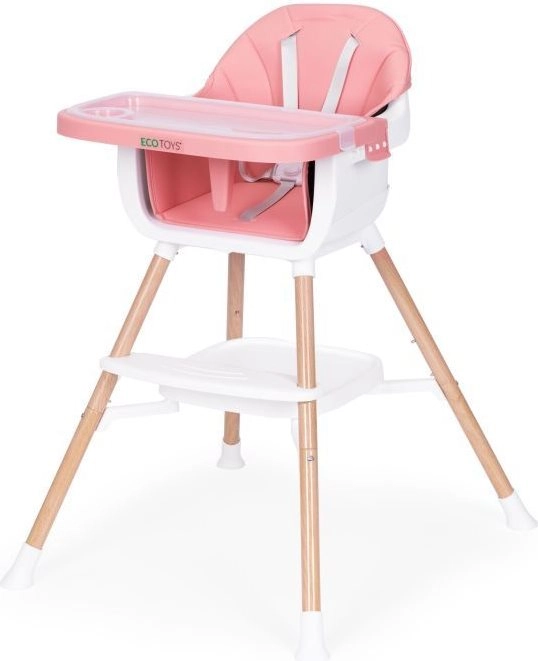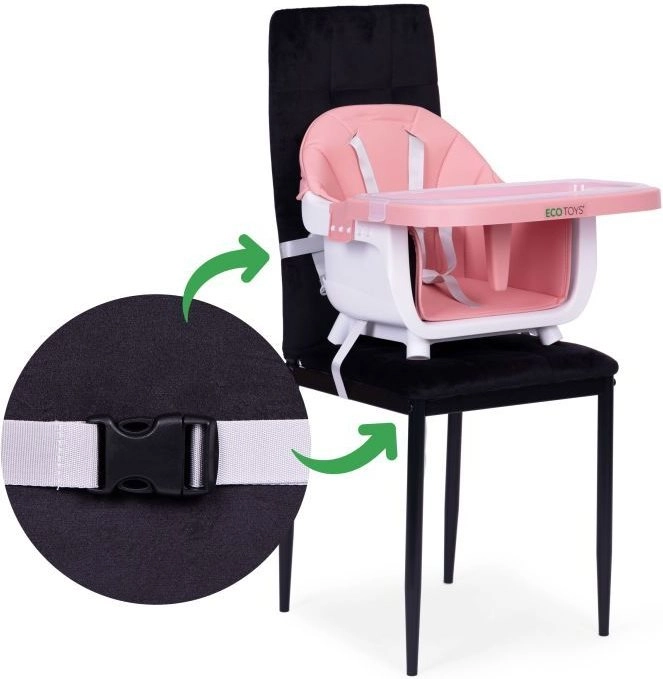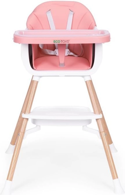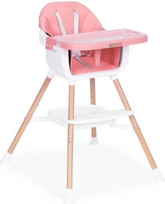 Práctica trona infantil 2 en 1 de la marca ECOTOYS para niños de 6 a 36 meses, que combina una trona alta y un asiento independiente para una silla estándar. Ofrece una estructura metálica estable, tapizado de eco cuero resistente y fácil de limpiar, bandeja de doble capa desmontable apta para lavavajillas, arnés de seguridad de 5 puntos, puntas antideslizantes, tope antideslizamiento y una práctica repisa bajo el asiento. Carga máxima 20 kg.