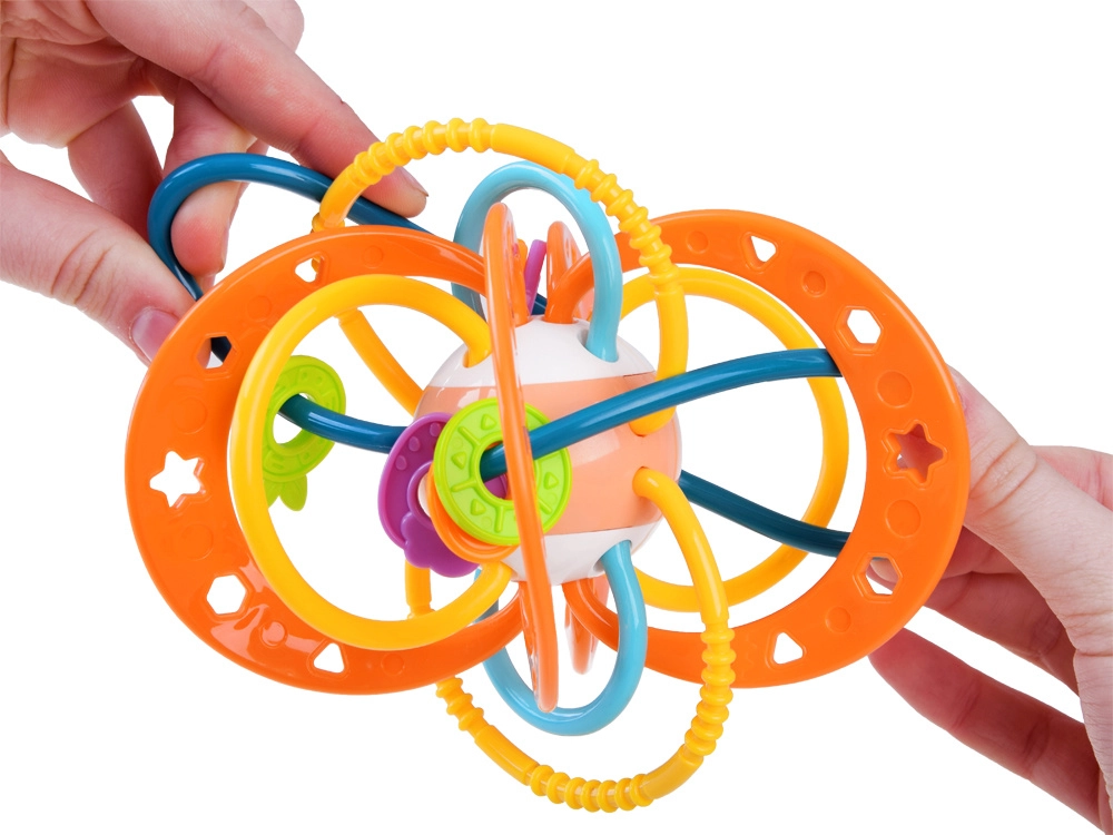 Este colorido mordedor con sonajero ofrece al bebé múltiples estímulos para el desarrollo sensorial. Los lazos entrelazados se agarran fácilmente con manos pequeñas, las texturas alternas masajean las encías y alivian las molestias durante la erupción dental. Su diseño ligero es ideal tanto en casa como de viaje.