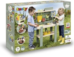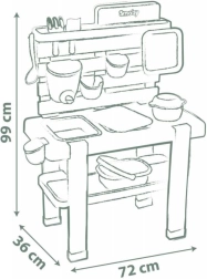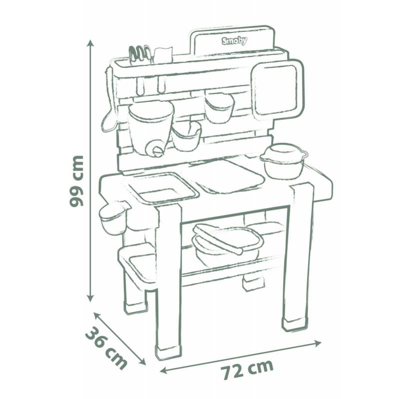 Incluye 15 prácticos accesorios (tamiz, cesta, cucharón, rastrillo, pala, etc.), superficies de apoyo, ganchos y una tapa de depósito para guardar y conservar “tesoros”. La estructura de plástico de alta calidad con protección UV mantiene los colores y está lista para el uso en exteriores.