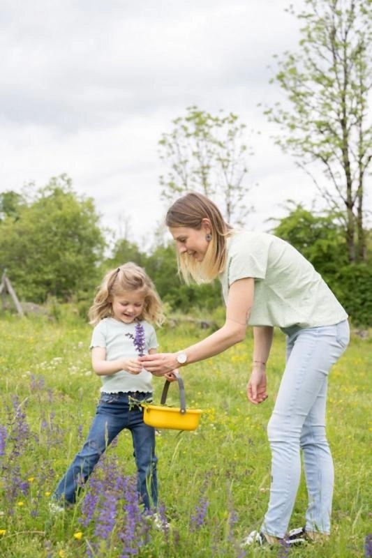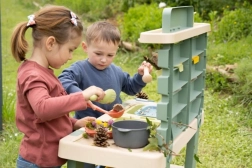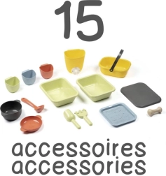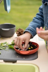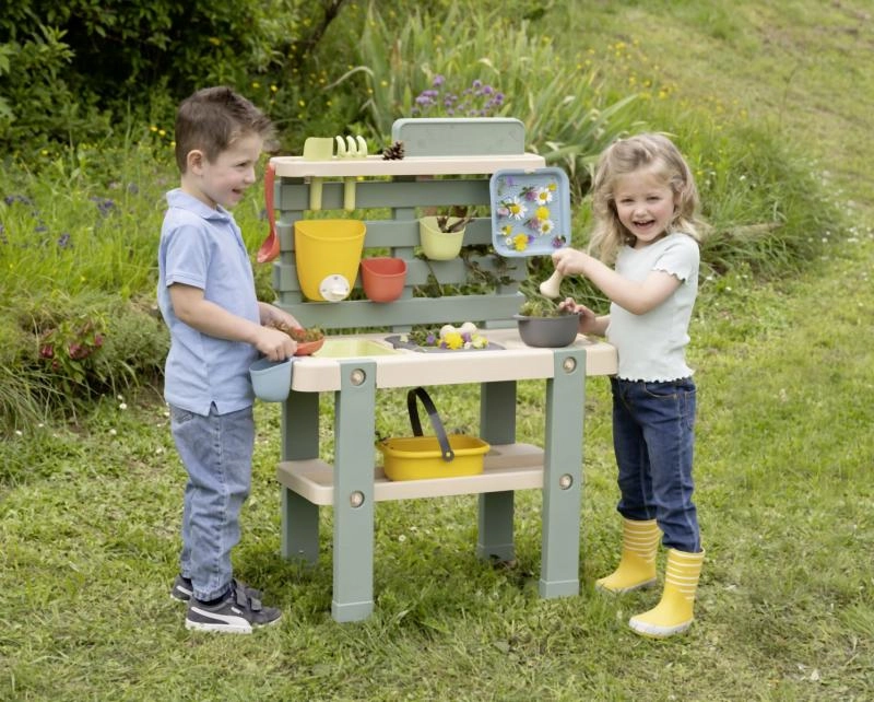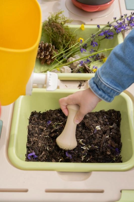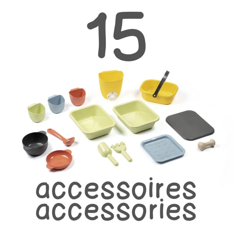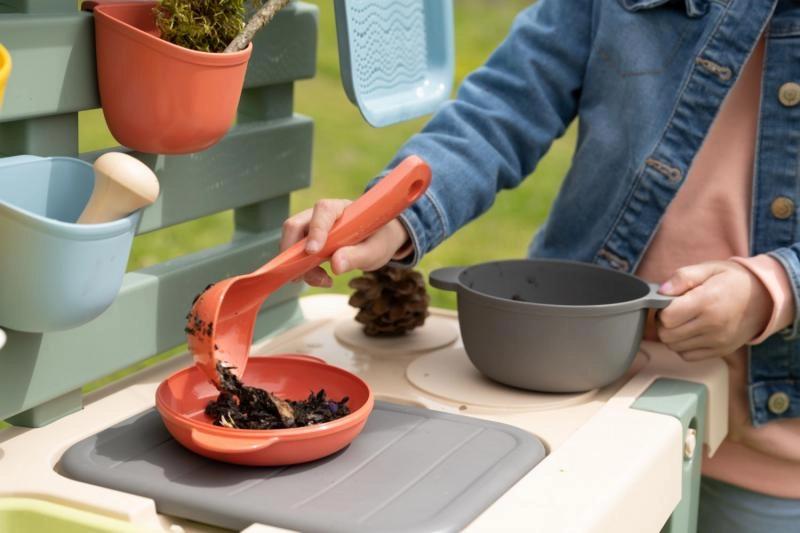 Un tamiz, cesta, cucharón, rastrillo, pala y otros accesorios inspiran a cocinar con barro, arena y flores, fomentando el juego compartido.