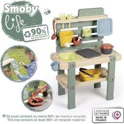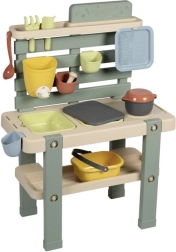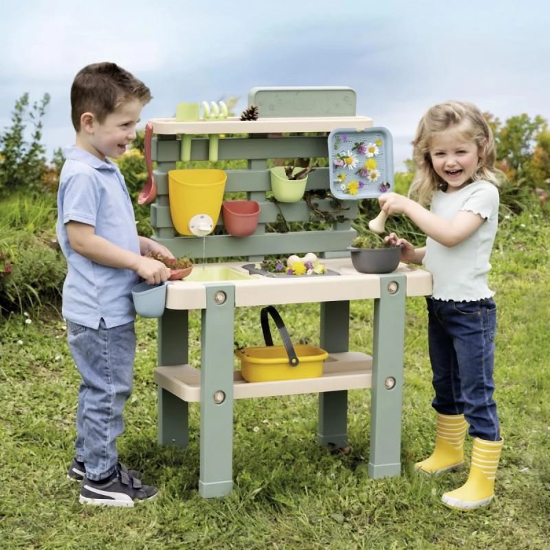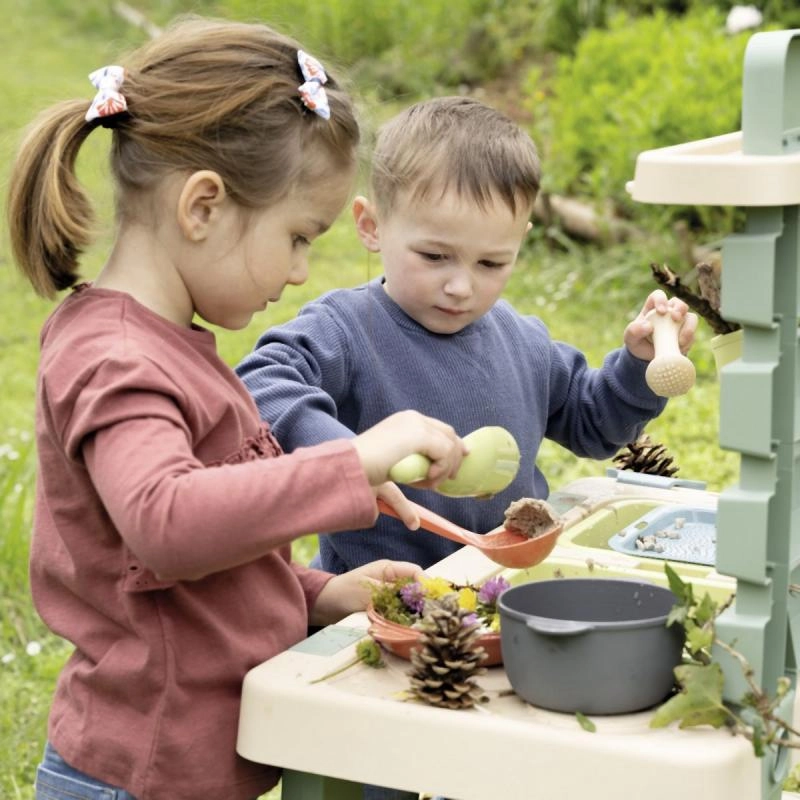 Esta resistente cocina exterior en colores naturales ofrece a los niños un espacio auténtico para jugar y experimentar con agua, arena y materiales naturales. Los cajones/recipientes extraíbles facilitan la manipulación y la limpieza, mientras que el grifo con cierre giratorio ayuda a dosificar el agua y desarrolla la motricidad fina.