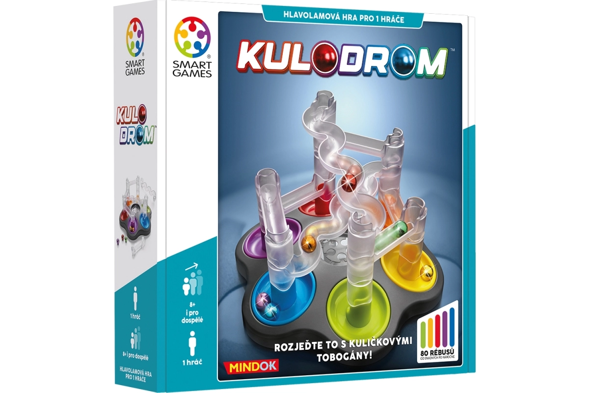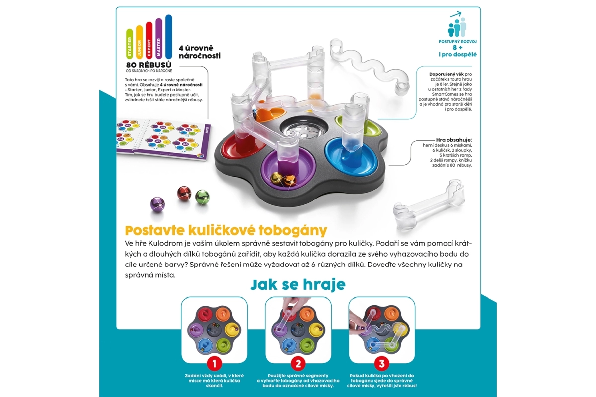 ¡Construye tus propios toboganes para canicas con el juego Smart Kulodrom! Tu tarea es montar correctamente los toboganes para que cada canica llegue a la meta. El juego incluye diversas piezas de tobogán y está destinado a un jugador a partir de 8 años.