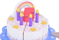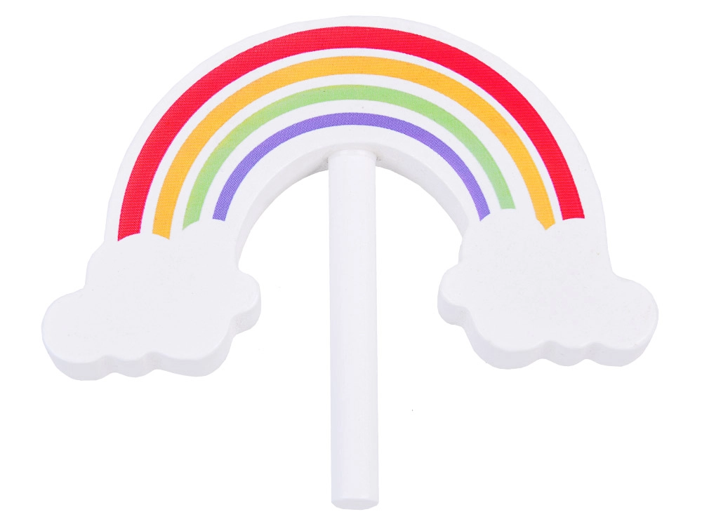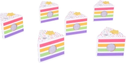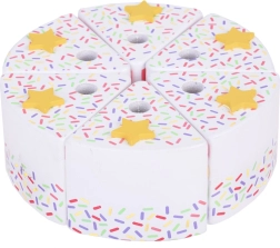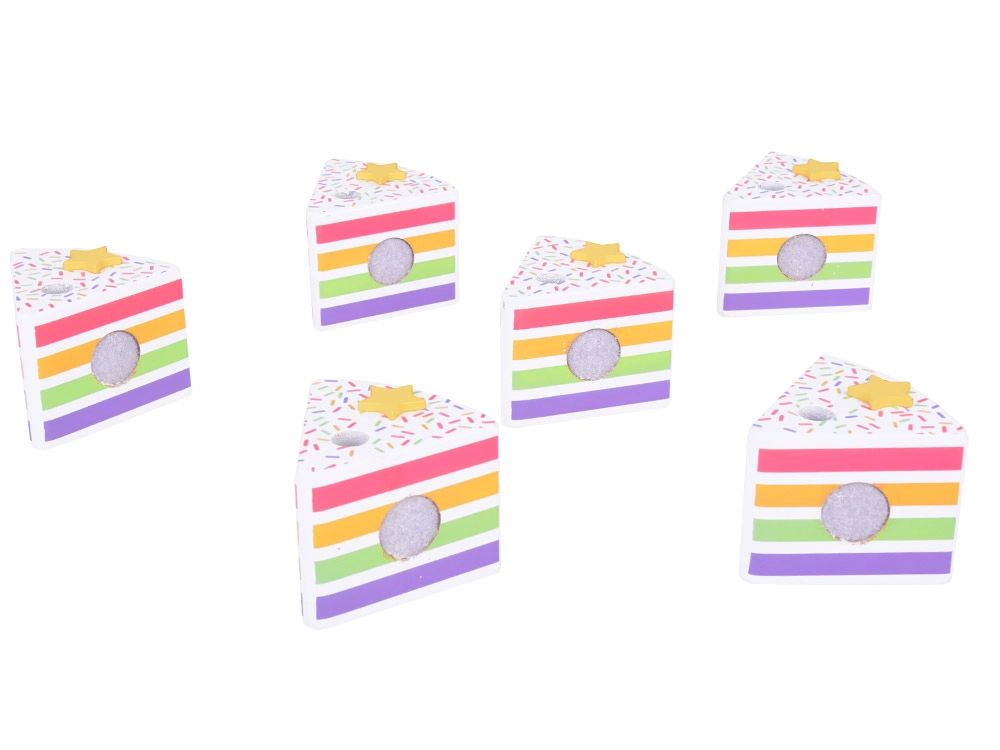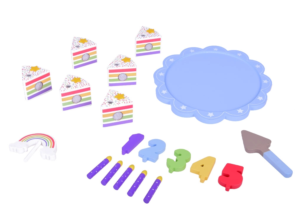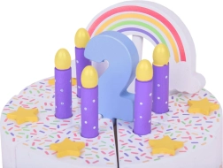 En la parte superior de la tarta hay un arcoíris de colores extraíble, que aporta un toque mágico a todo el conjunto. Cada porción de tarta tiene un espacio para una vela, lo que la convierte en una opción perfecta para jugar a las fiestas de cumpleaños.