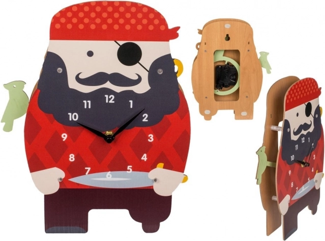 Este creativo reloj con forma de pirata será un elemento divertido en el dormitorio infantil. El gracioso loro verde en el hombro del pirata se mueve a cada hora en punto, lo que despierta alegría y curiosidad en los niños.