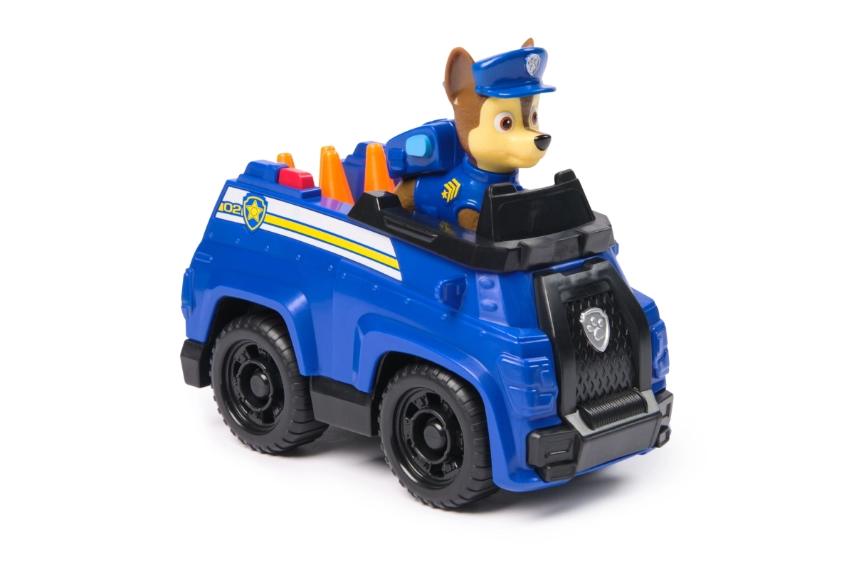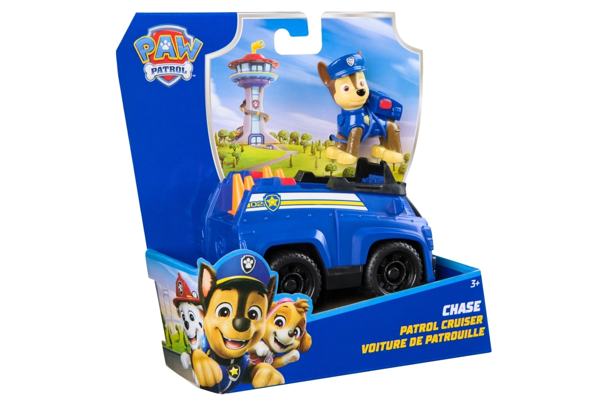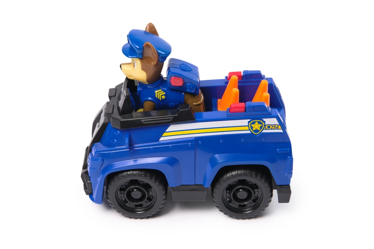 ¡Chase está listo para salvar el día! Abrocha la figura en el asiento del conductor y lánzate a la acción con su vehículo policial de desplazamiento suave. Los elementos realistas, los colores llamativos y el diseño resistente garantizan largas horas de diversión inspirada en el mundo de Patrulla Canina.