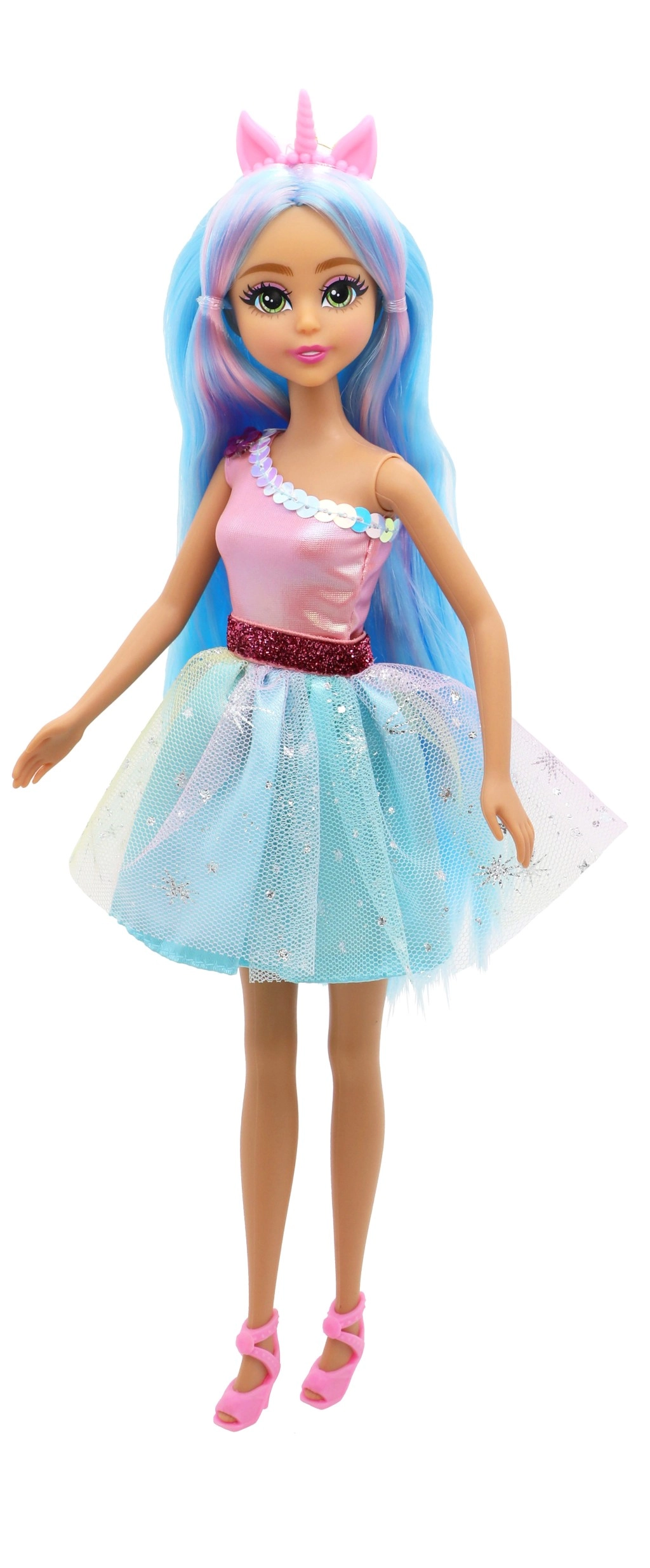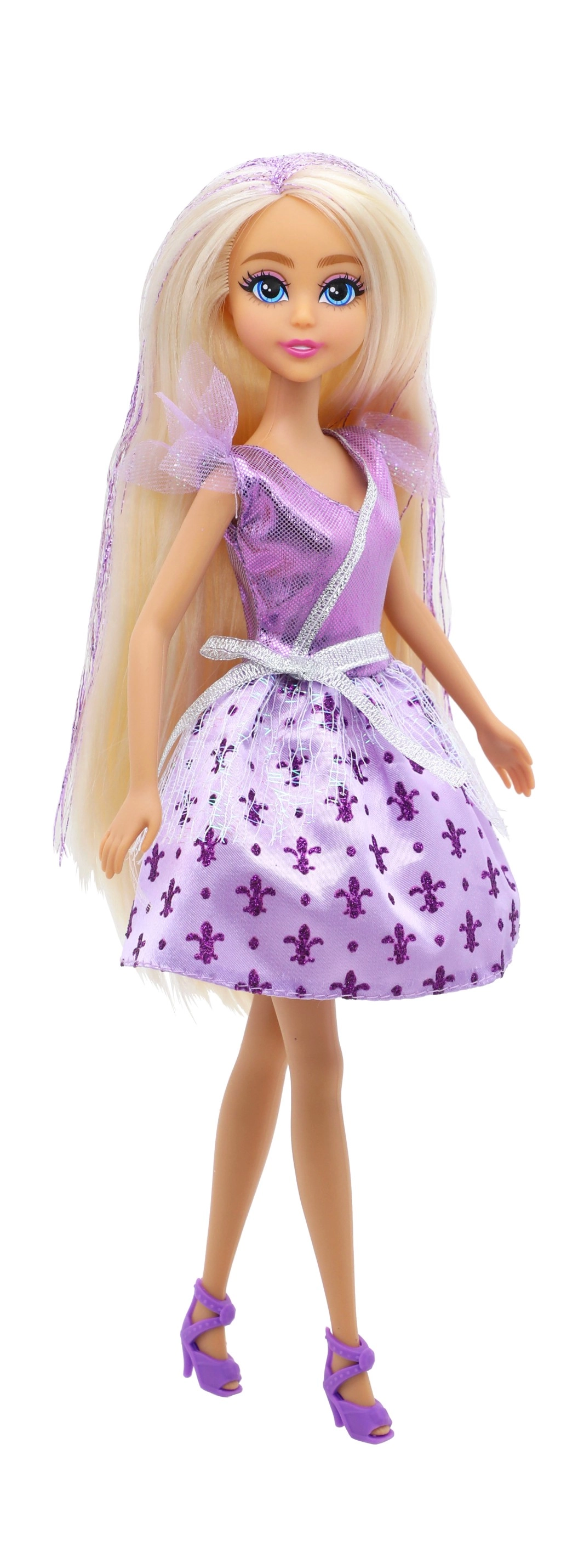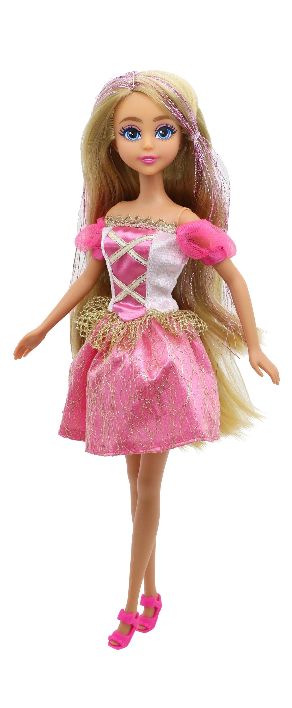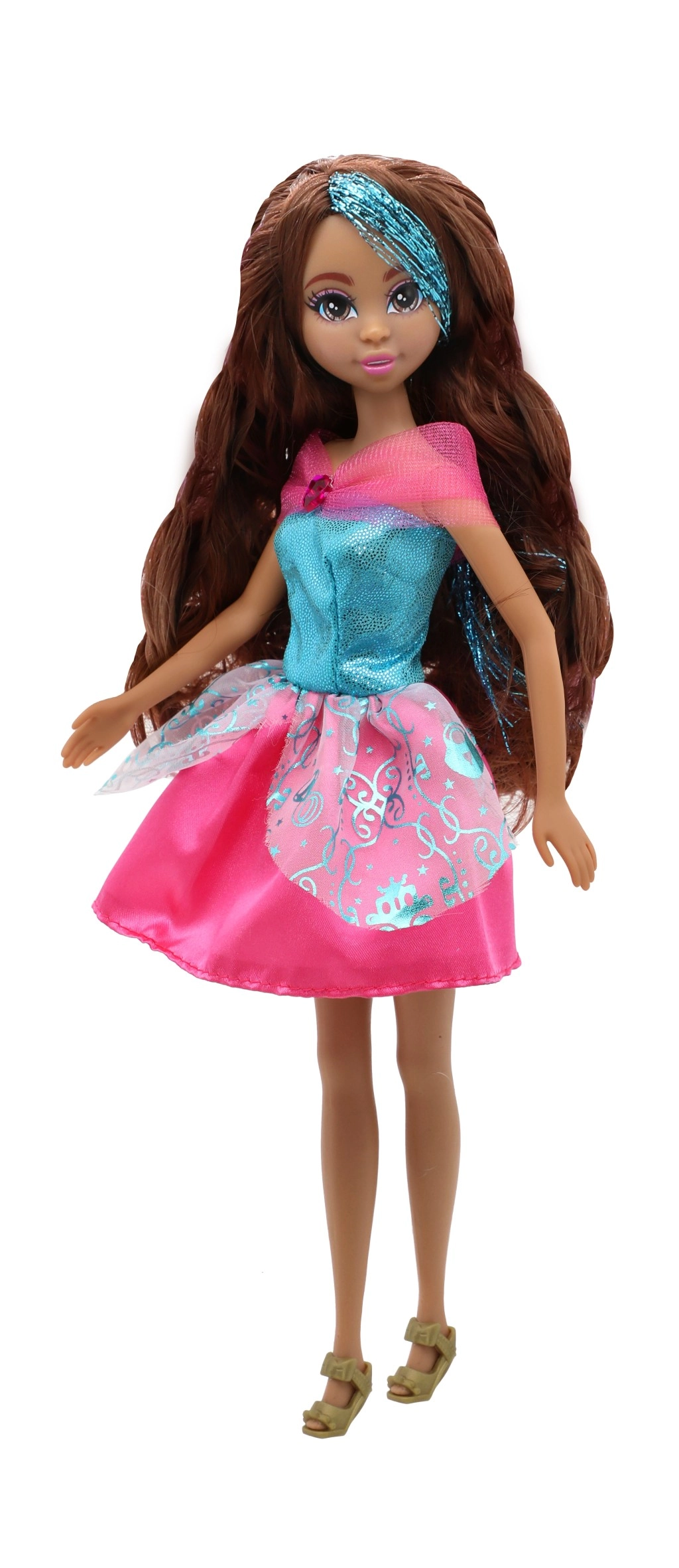 Un vestido brillante, detalles delicados y zapatitos a juego convierten a la muñeca en una auténtica princesa que ilumina cualquier habitación infantil.