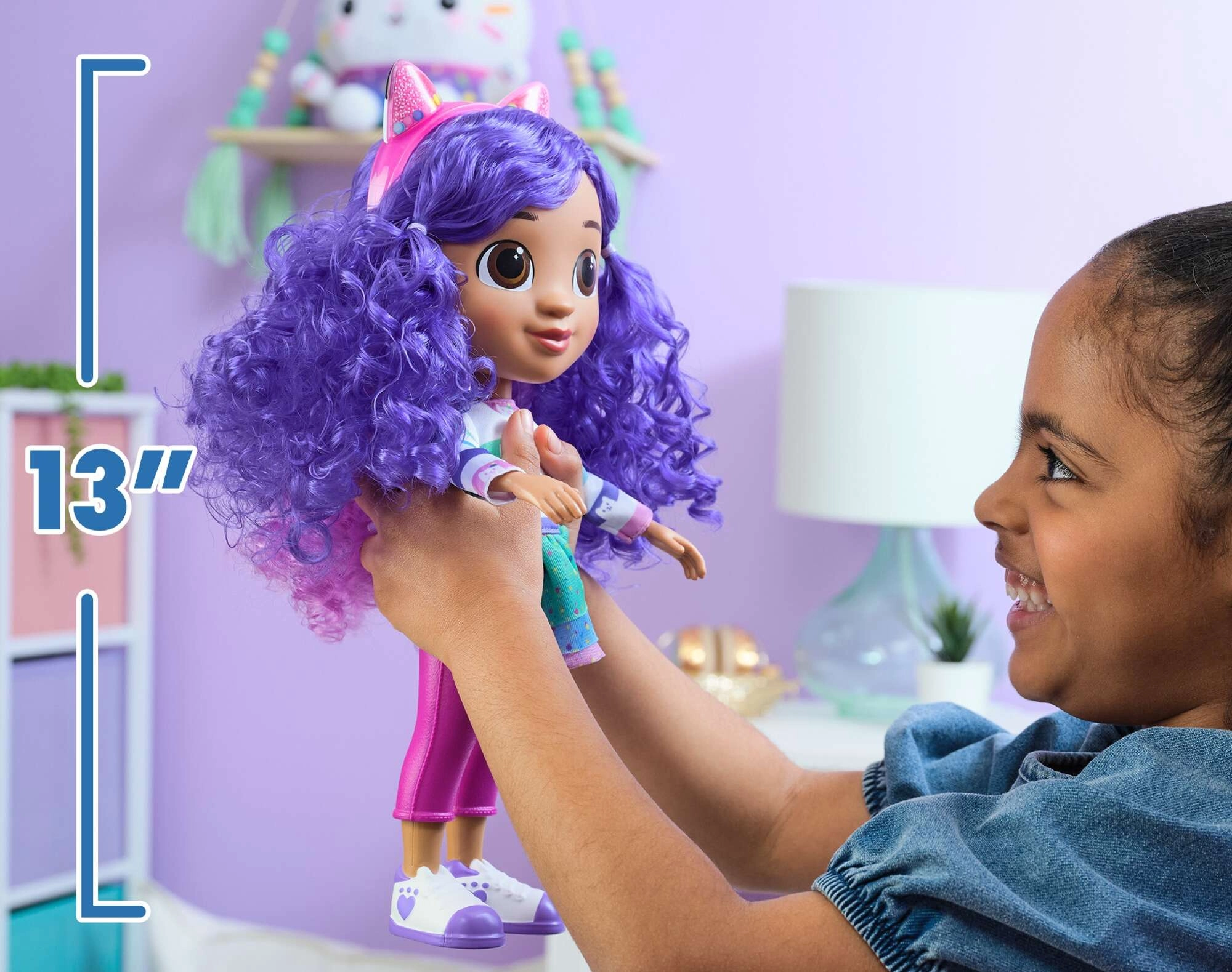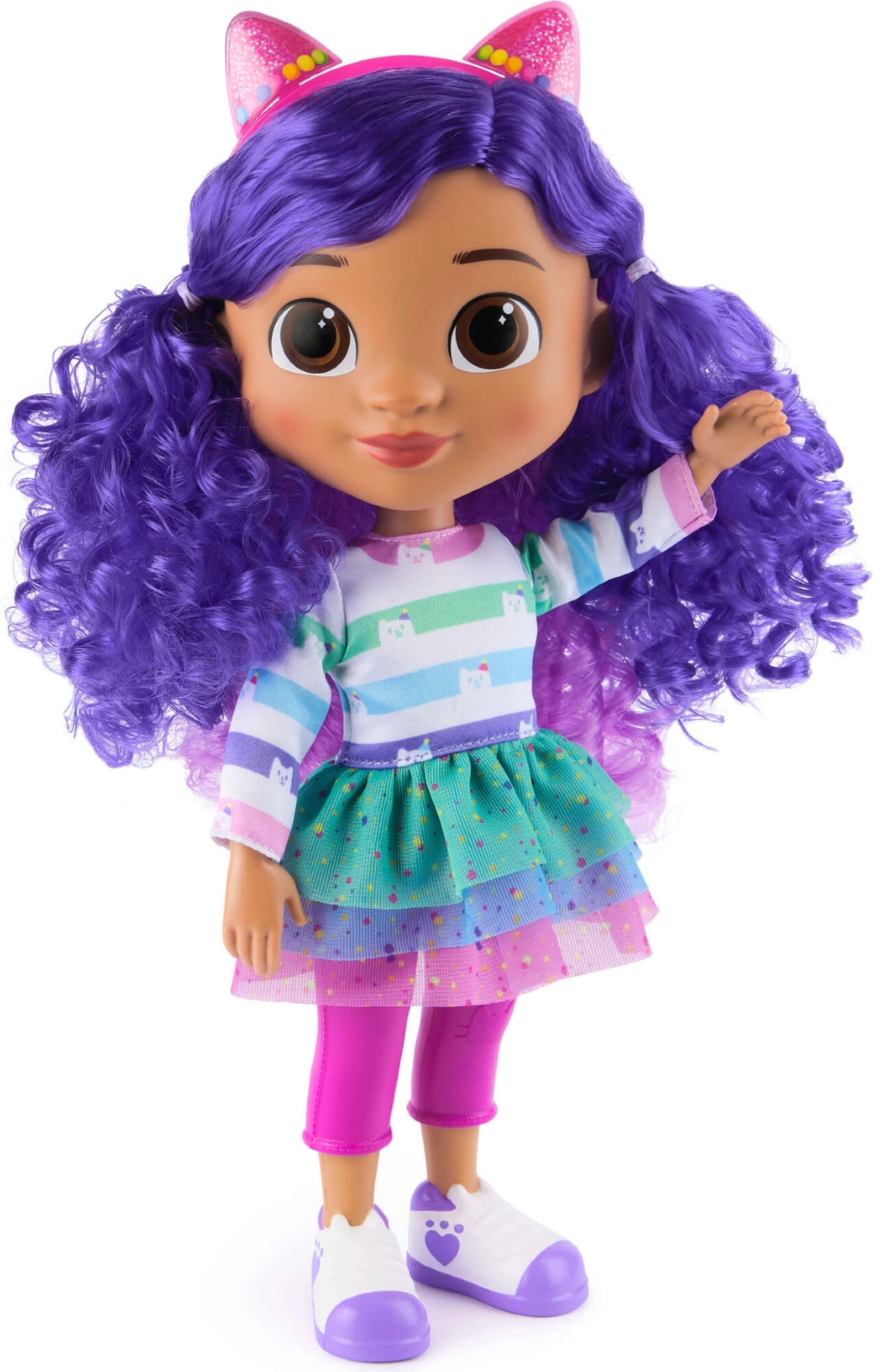 Descubre la magia de la serie La Casa de Muñecas de Gabby (Gabby’s Dollhouse) con la encantadora muñeca interactiva Gabby de 33 cm de altura. Cuenta con una diadema de gatita giratoria con orejitas intercambiables, un conjunto de fiesta con estilo y, al pulsar el botón del pecho, reproduce efectos de sonido y melodías de la serie. Ideal para el juego creativo, para abrazar y para ampliar el mundo de la Casa de Muñecas con más figuras y accesorios.