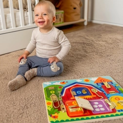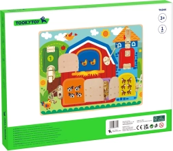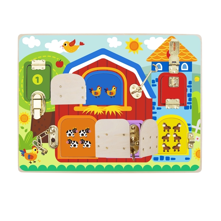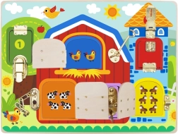 Descubre un juguete divertido y educativo para niños a partir de 3 años: una tabla manipulativa de madera con temática de granja de Tooky Toy. Seis puertecitas de colores con diferentes cerraduras, pestillos y cadenas desarrollan la motricidad fina, el pensamiento lógico y la coordinación ojo–mano, mientras que bajo cada puerta esperan imágenes de animales como una agradable sorpresa.