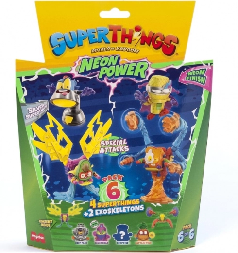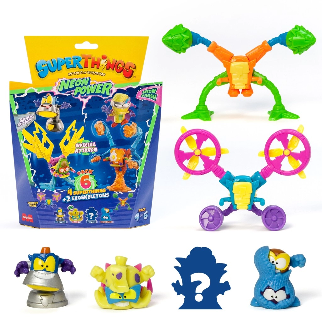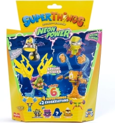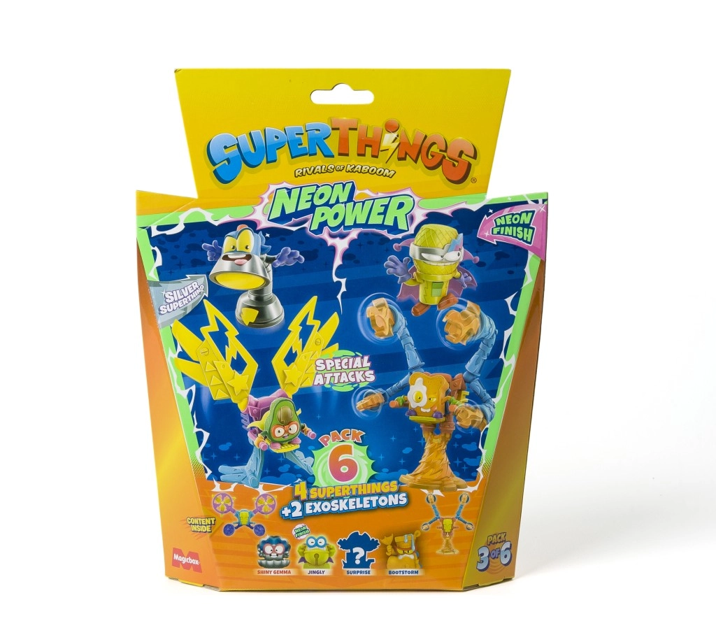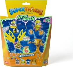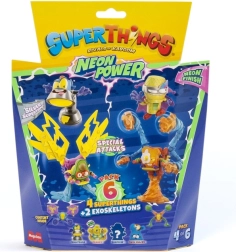Entra en la ciudad de Kaboom y amplía tu colección con SuperThings: Neon Power. Cada paquete ofrece una combinación de 4 figuras heroicas (o villanas) y 2 exoesqueletos que aportan fuerza y estilo a tus batallas. El acabado neón garantiza que tus personajes destaquen en cualquier acción.